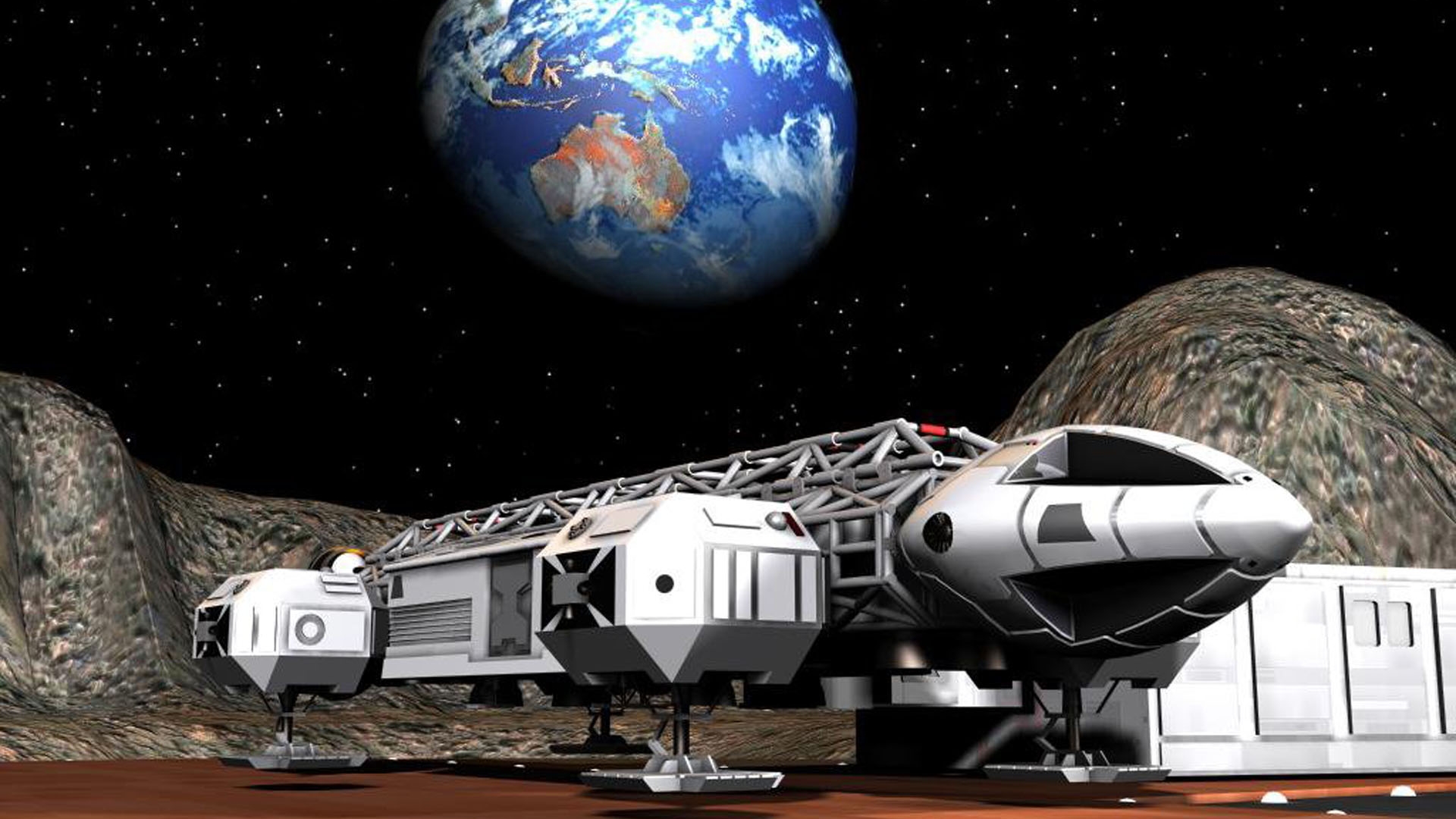 Description: A space station with a planet in the background and a satellite vehicle on the ground in front of it.