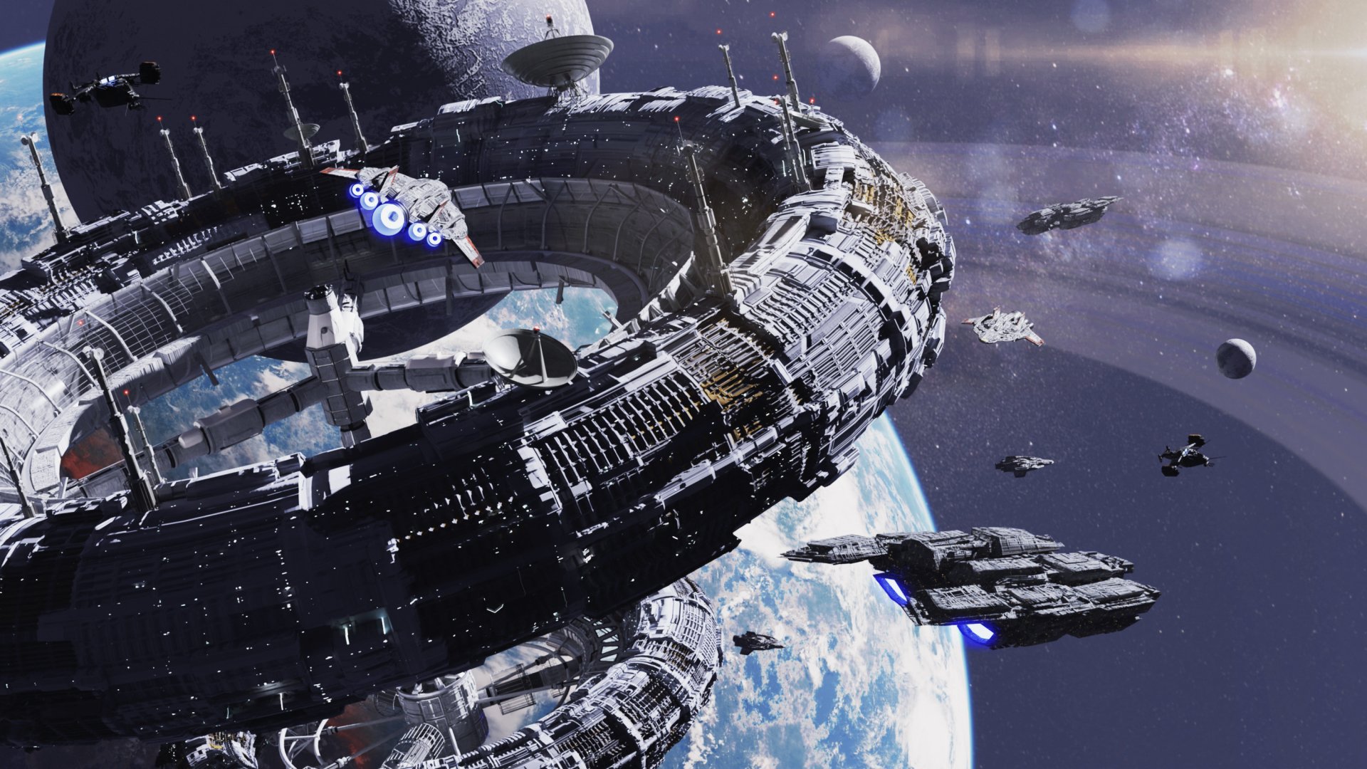 Description: A space station in the middle of a planet with a spaceship in the background and a distant star in the sky.