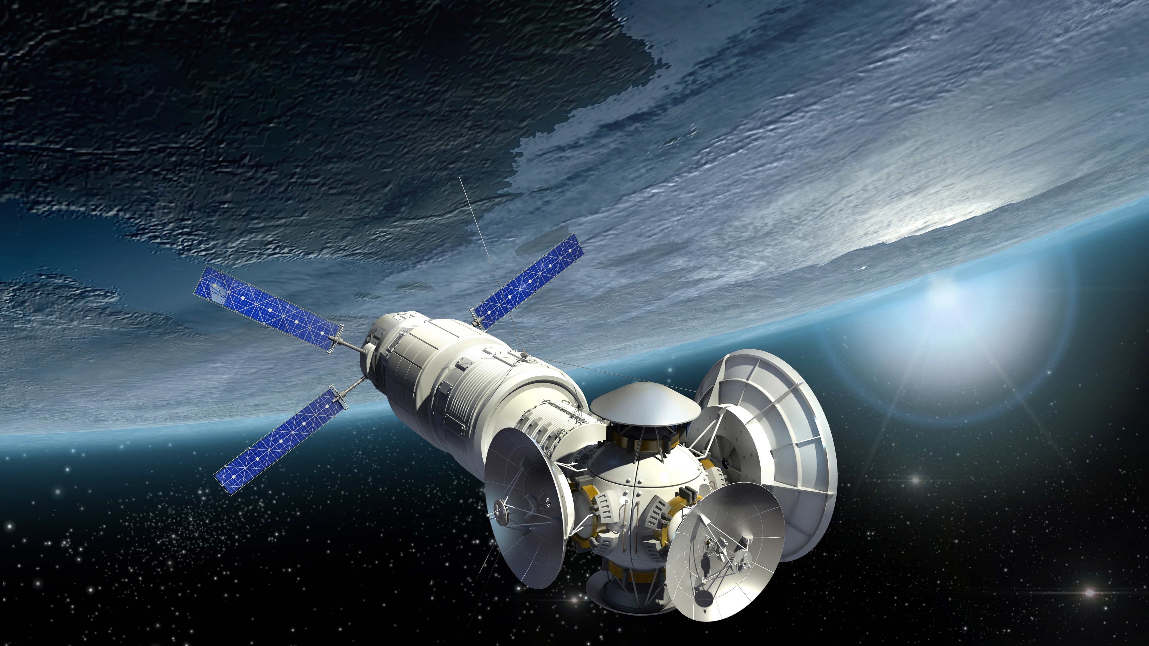 Description: A space station in the middle of a space station with a satellite in the background and a distant planet in the foreground.