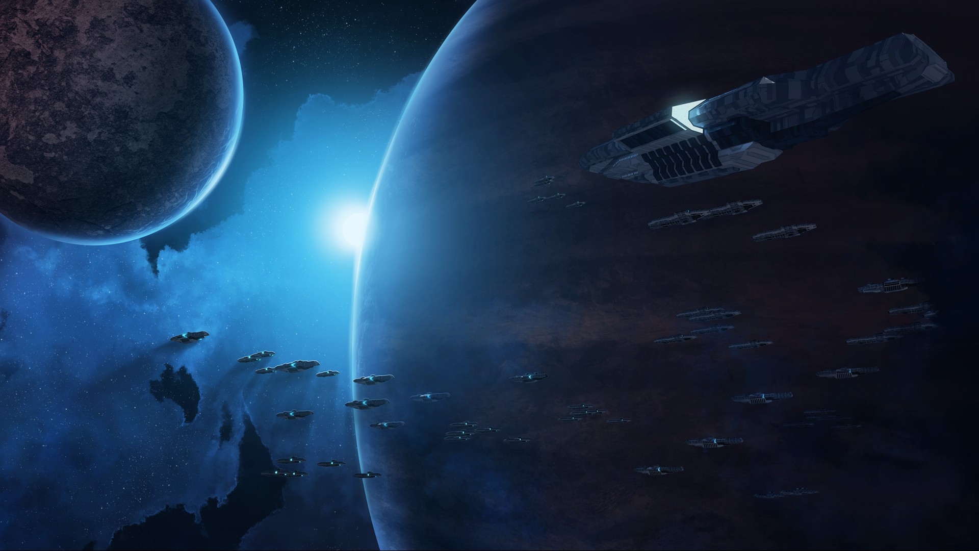 Description: A space station in the distance with a star trek ship in the foreground and a distant planet in the background.