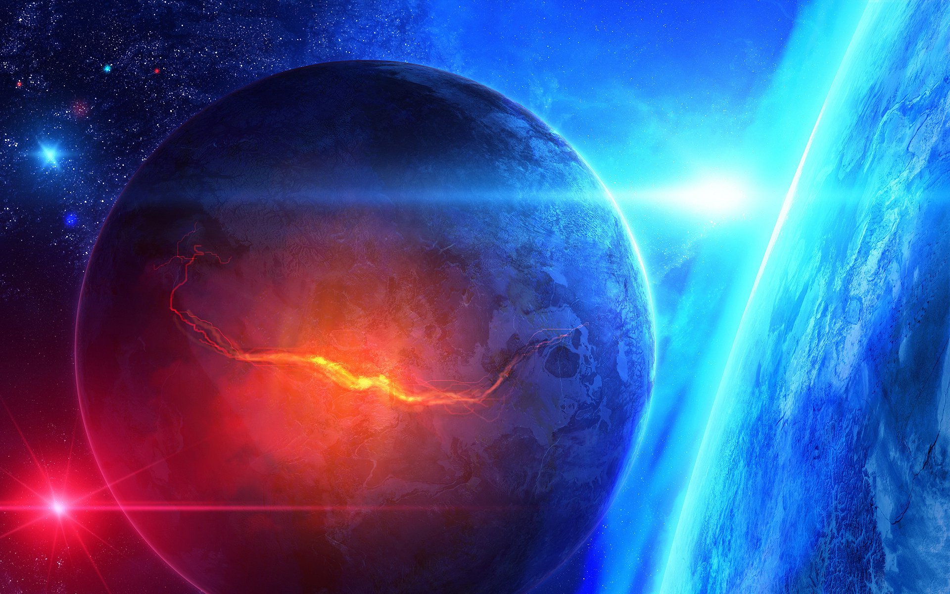 Description: A view of a space station from space with a bright red light coming from the center of the image.