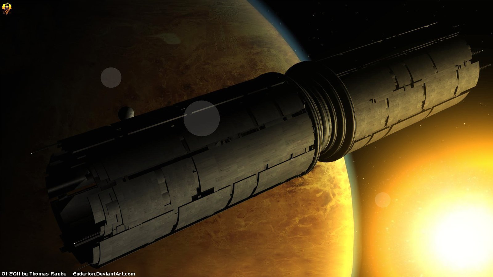 Description: A computer generated image of a space station in the sun's shadow.