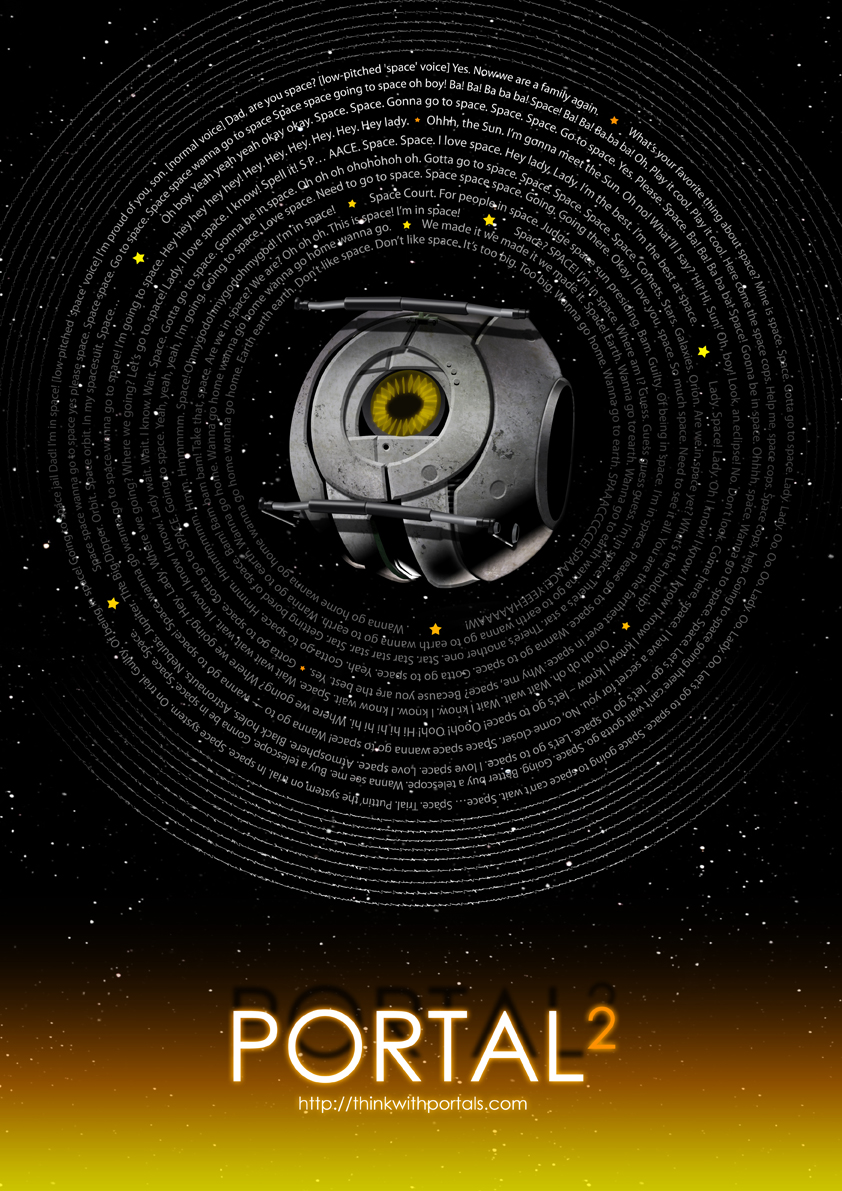Description: A poster with a space station in the middle of it and a yellow circle around it that says portal 2.