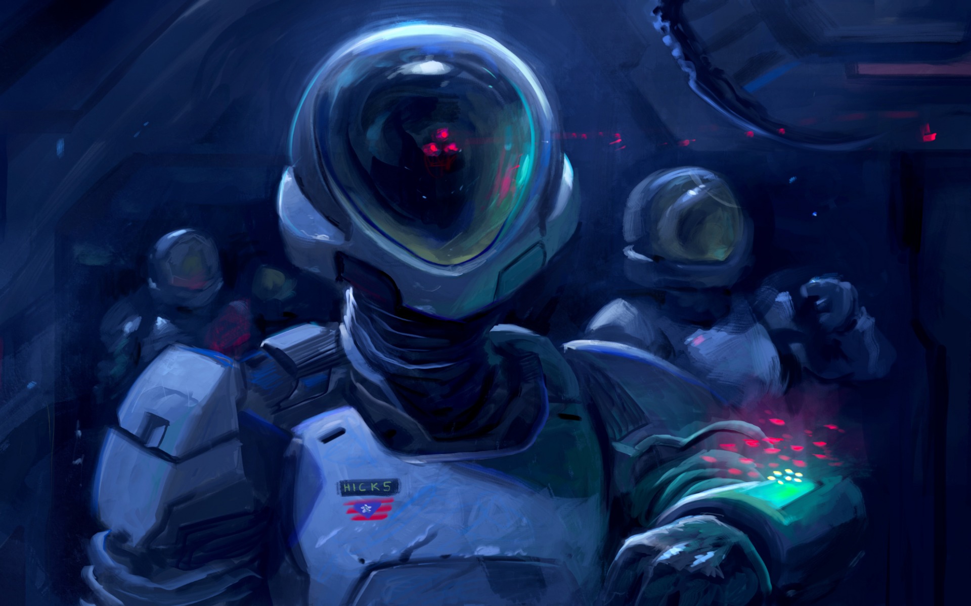 Description: A man in a space suit holding a glowing object in his hand and a helmet on his head.