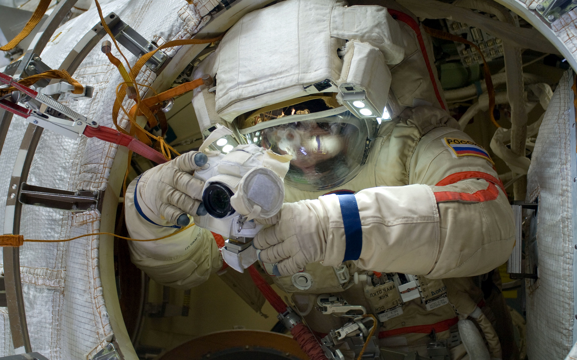 Description: A man in a space suit holding a device in his hand and looking into the camera lens of the space station.