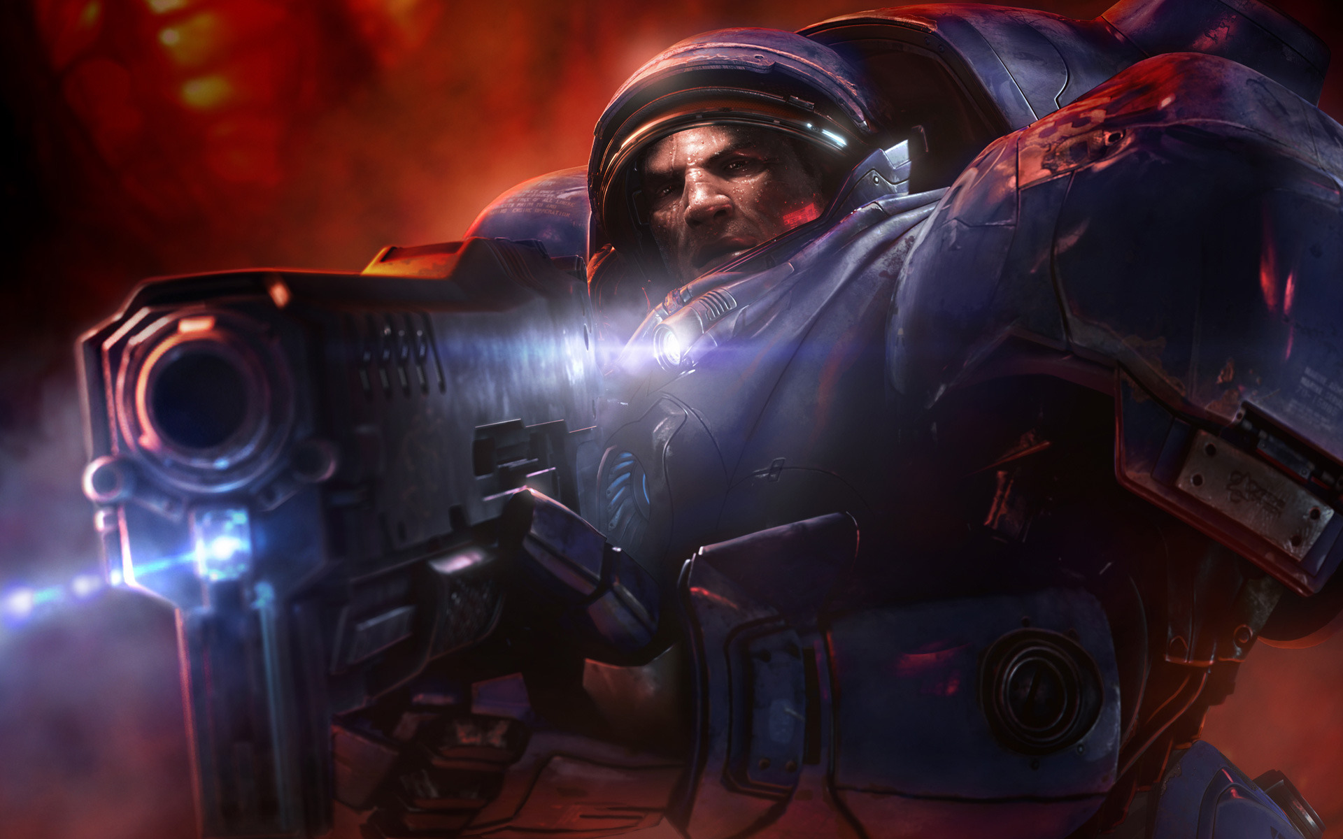 Description: A man in a space suit holding a large machine gun in his hand and a red light shining on his face.