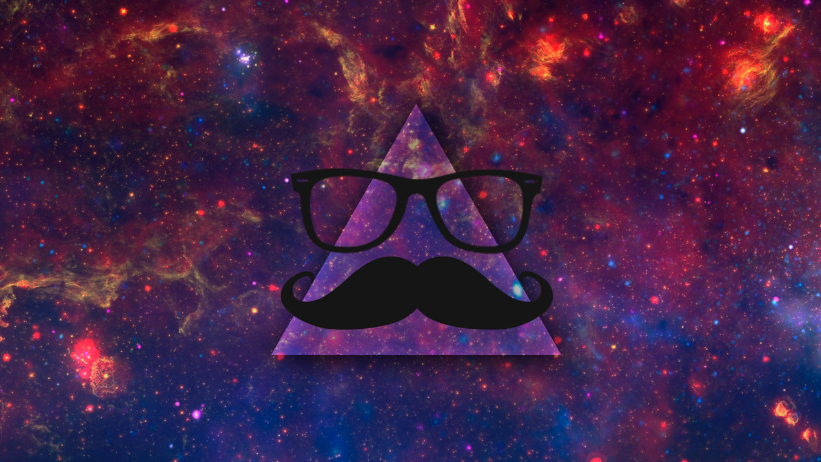 Description: A space scene with a triangle with a mustache and glasses on it and a space background with stars and a purple triangle with a mustache.