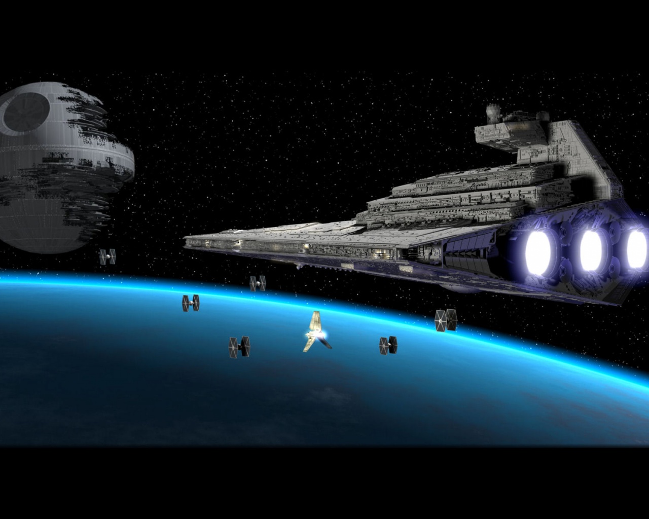 Description: A space ship flying over a blue planet with a star wars ship in the background and a space shuttle in the foreground.