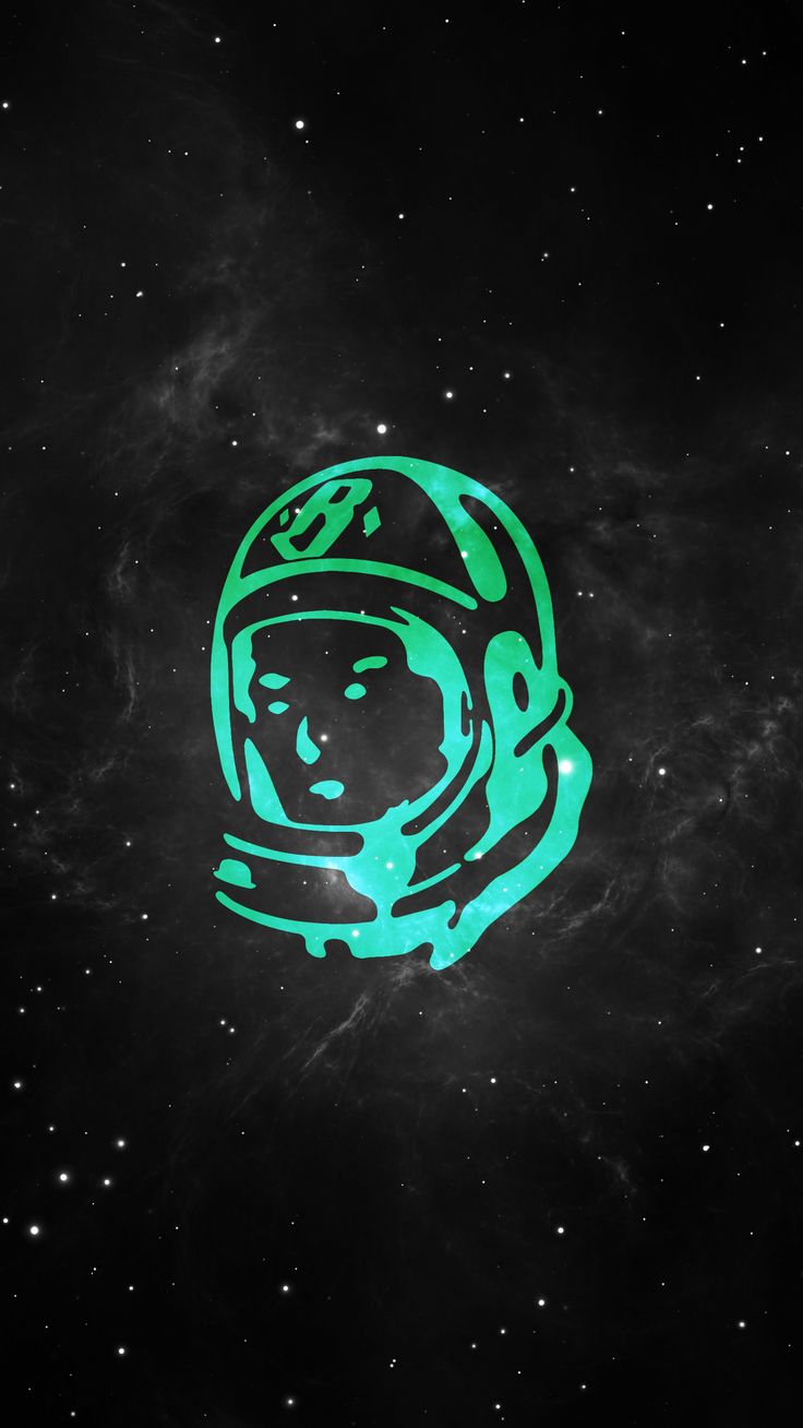 Description: A spaceman in a helmet with a green glow on it's face and stars in the background.