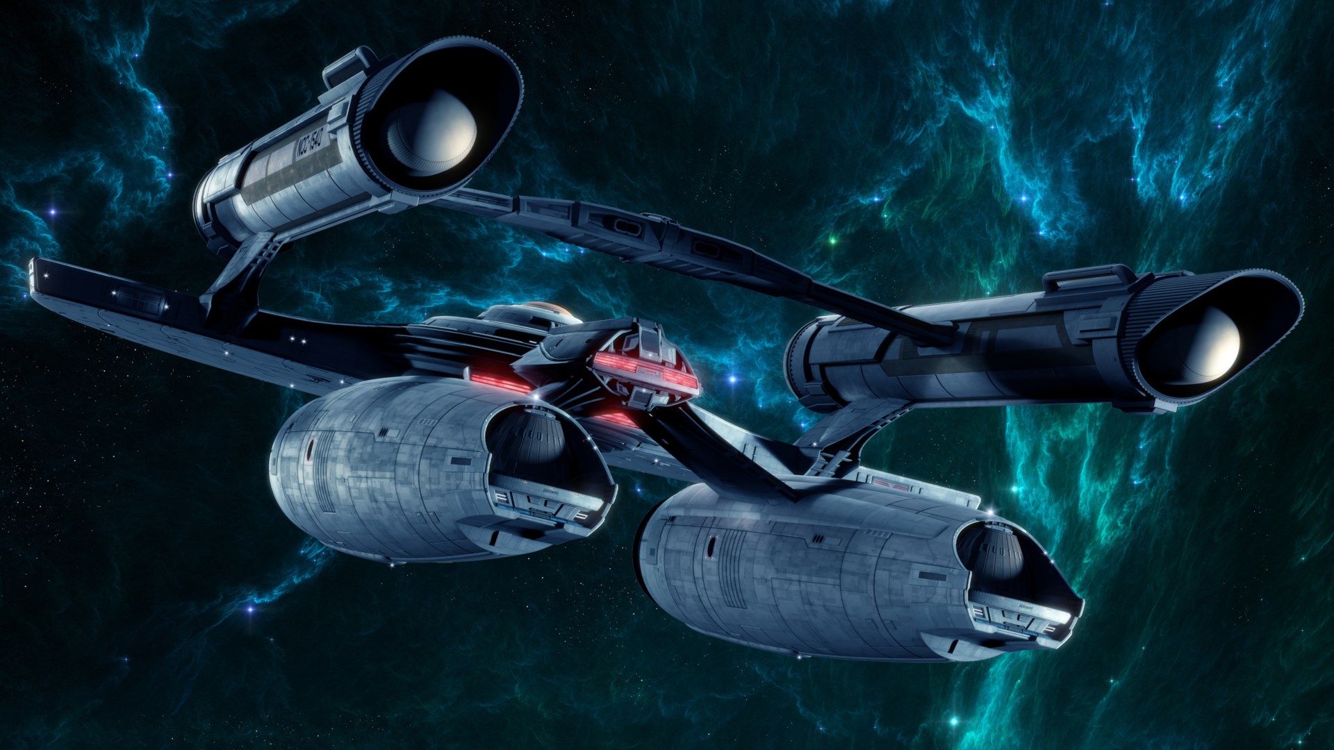 Description: A space ship floating in the middle of a galaxy with a red light on it's side and a black light on its side.