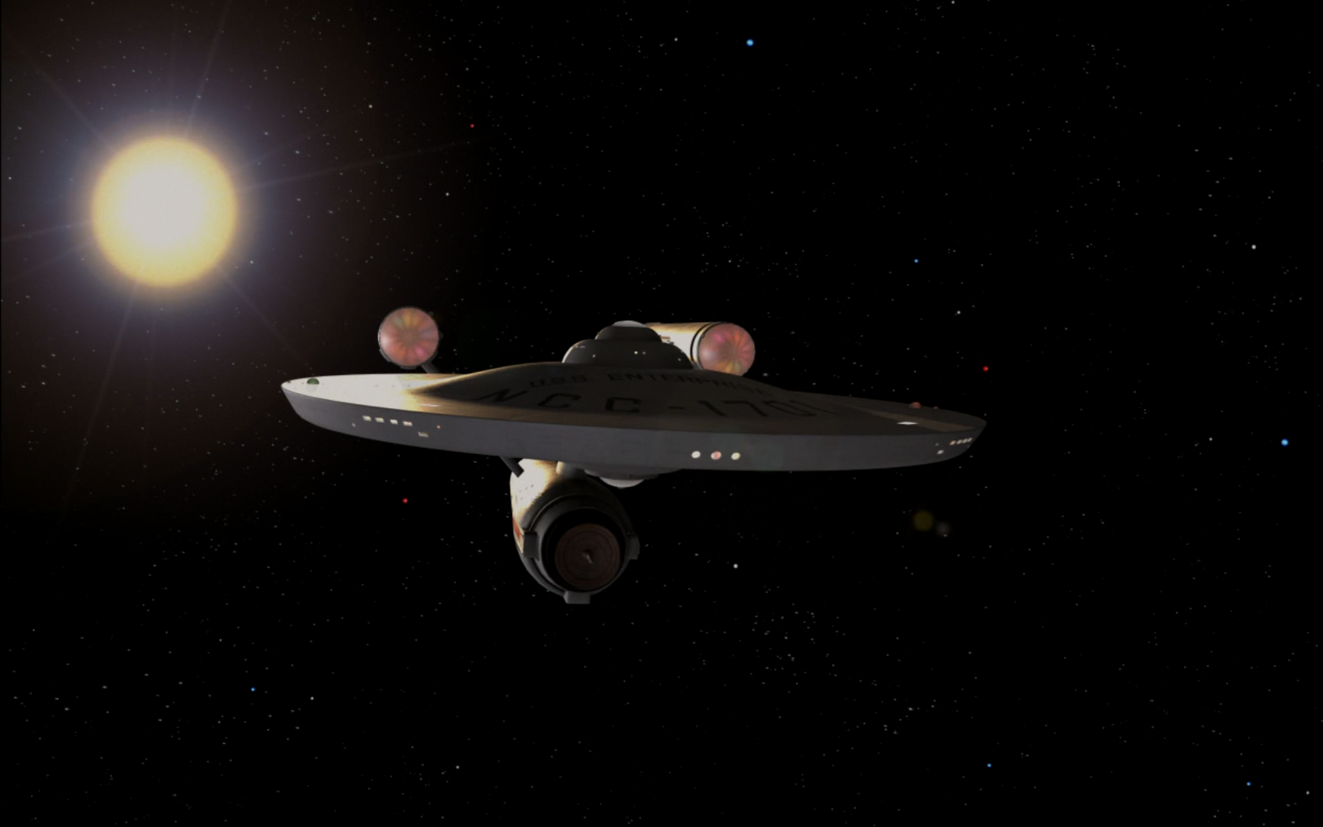 Description: A space ship flying through the night sky with a bright sun in the background and stars in the sky.