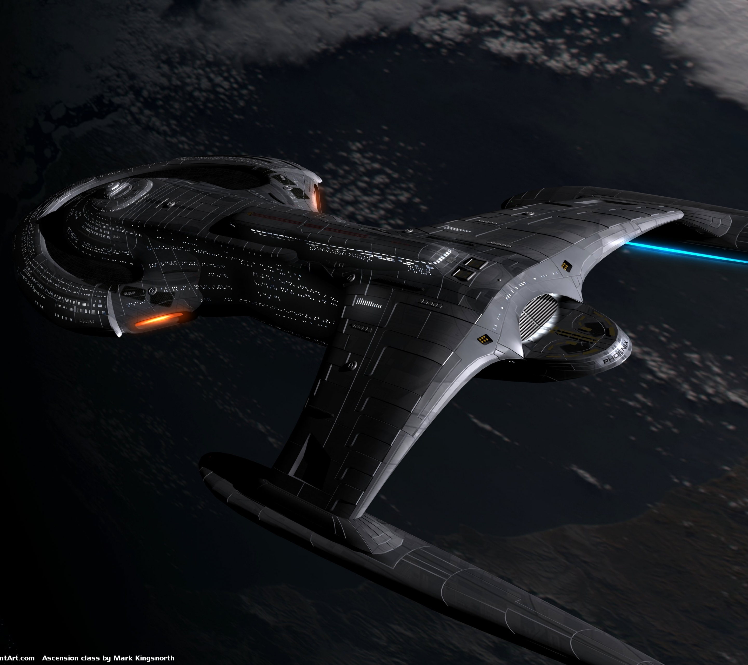 Description: A space ship flying through the sky with a beam in its mouth and a light on its side of the ship.