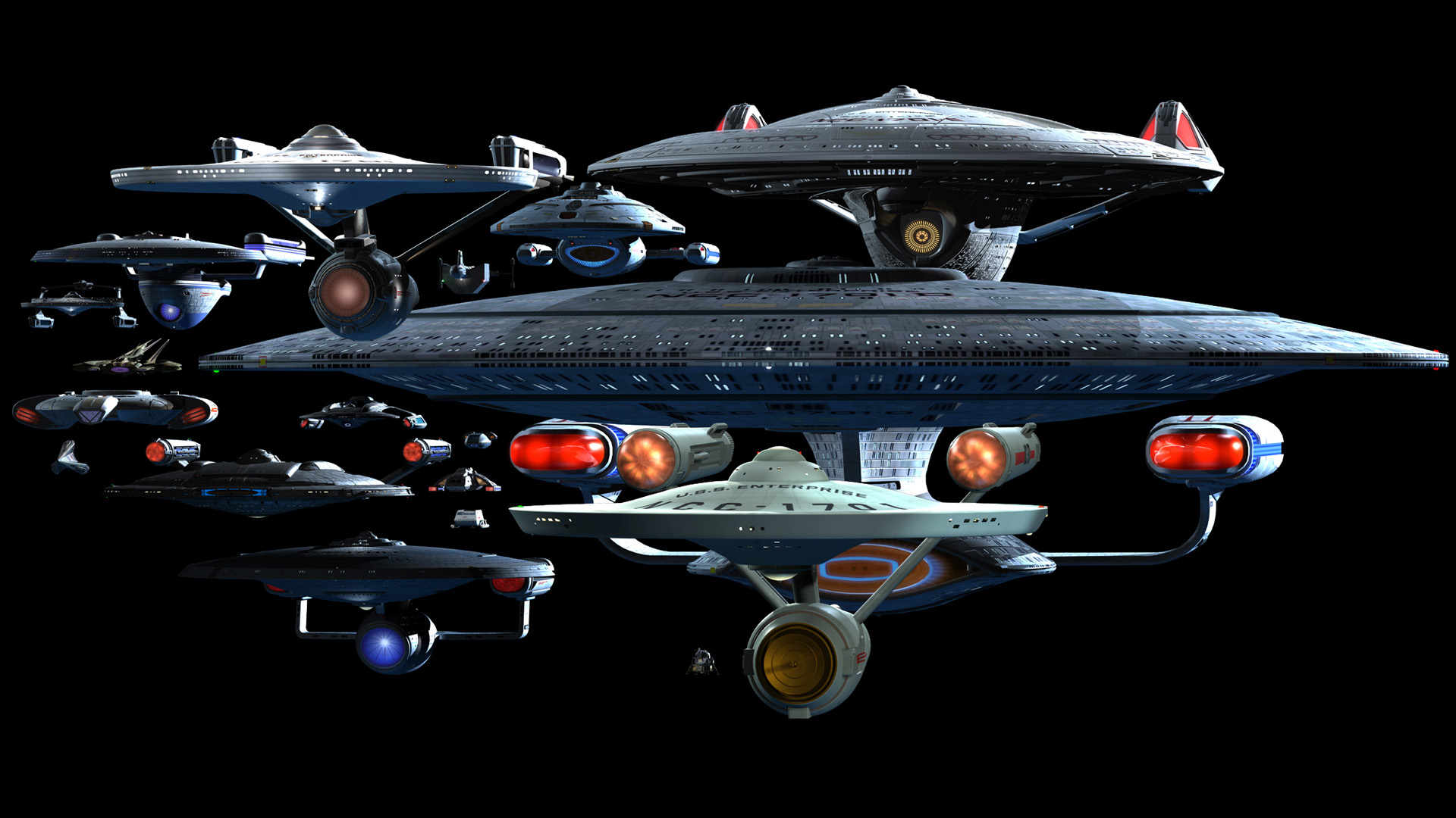Description: A bunch of spaceships are flying in the air together in a black background with a red light on.