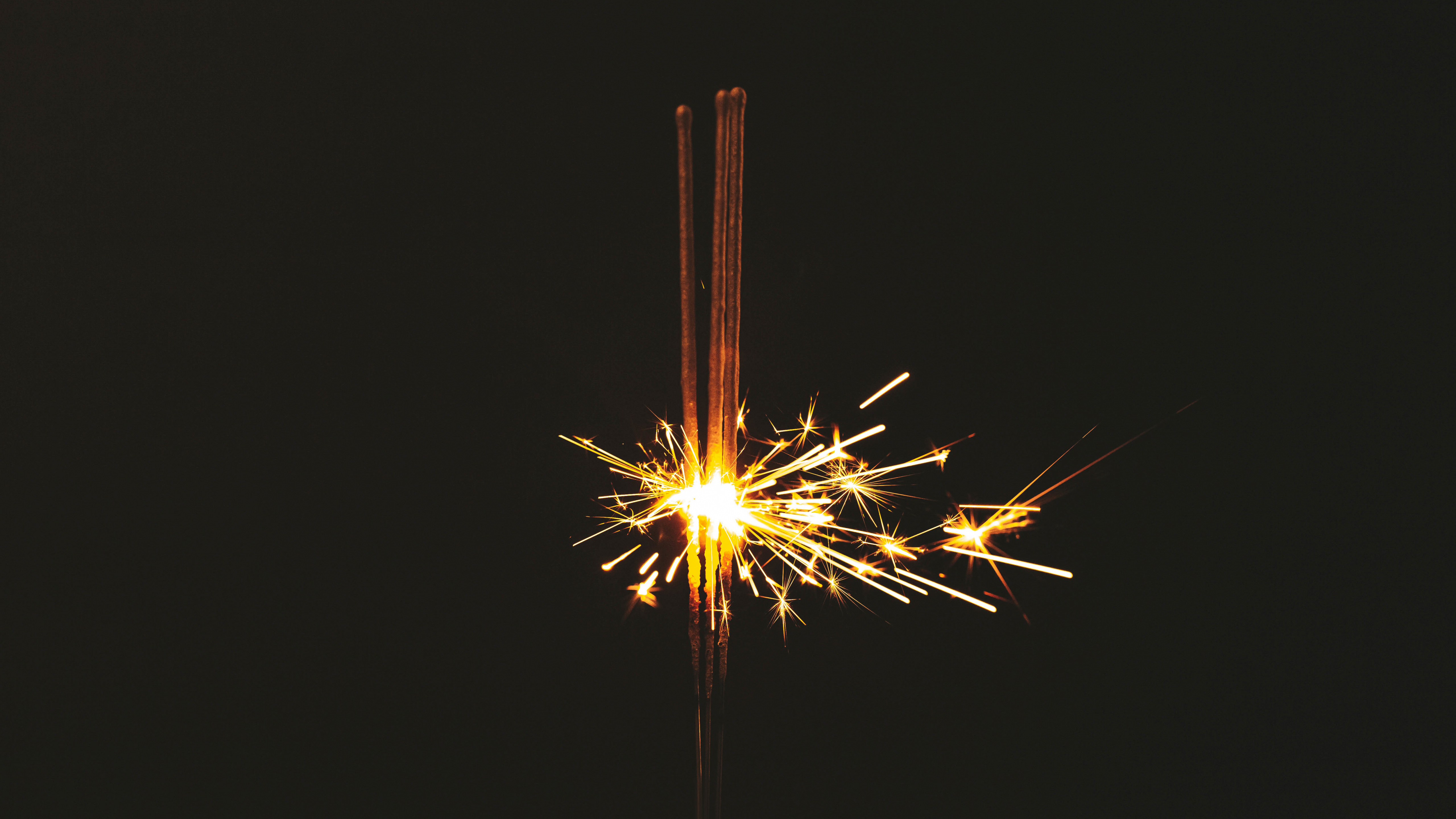 Description: A sparkler is lit up in the dark with yellow and red lights on it's side and a black background.