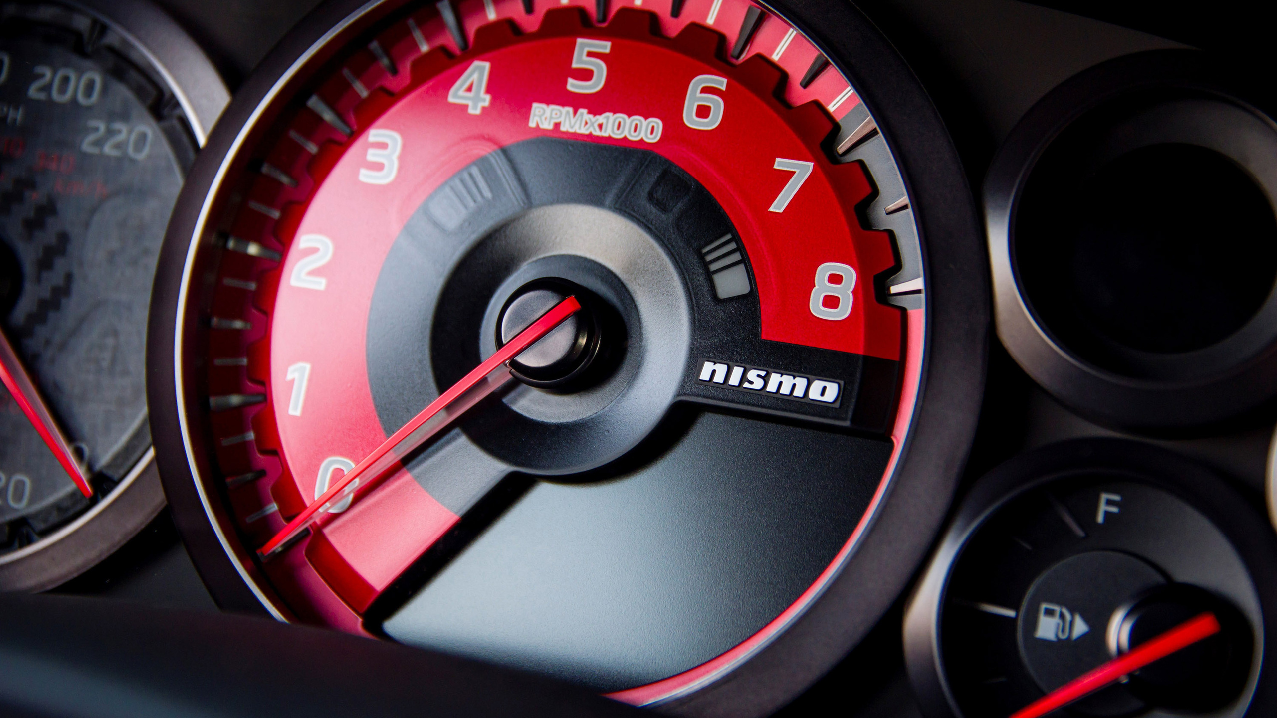 Description: A close up of a speedometer on a car dashboard with red and black numbers and numbers on the dial.