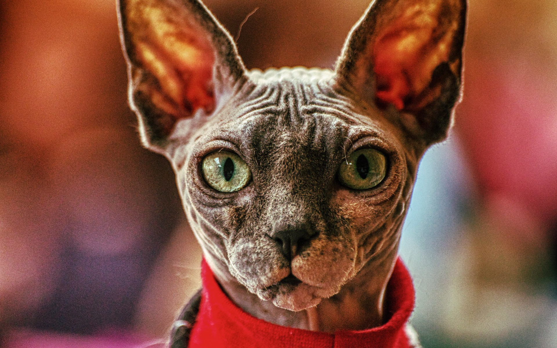 Description: A sphy cat with a red collar and green eyes looking at the camera with a blurry background.