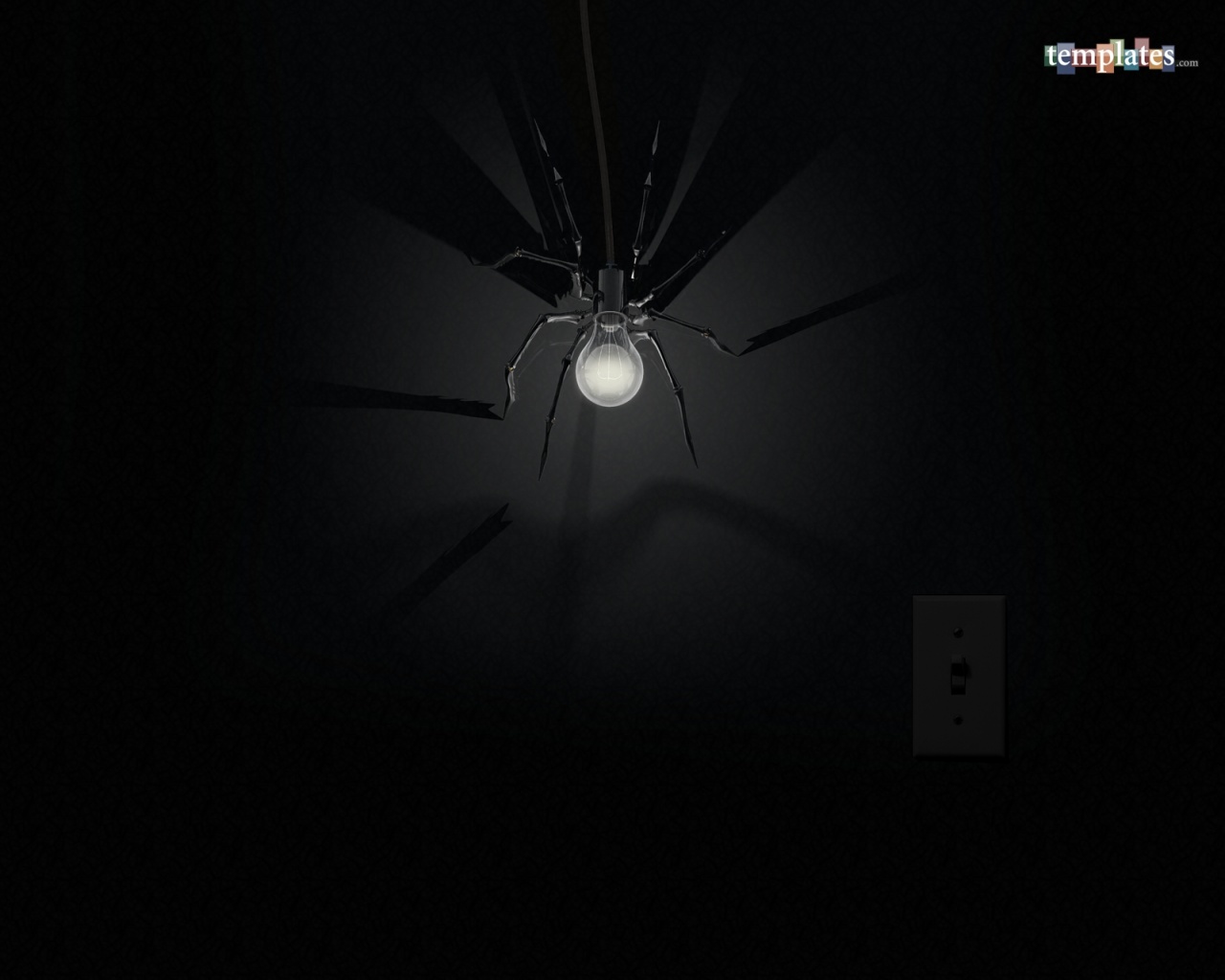 Description: A spider lamp in the dark with a light bulb on it's side and a spider crawling on the wall.