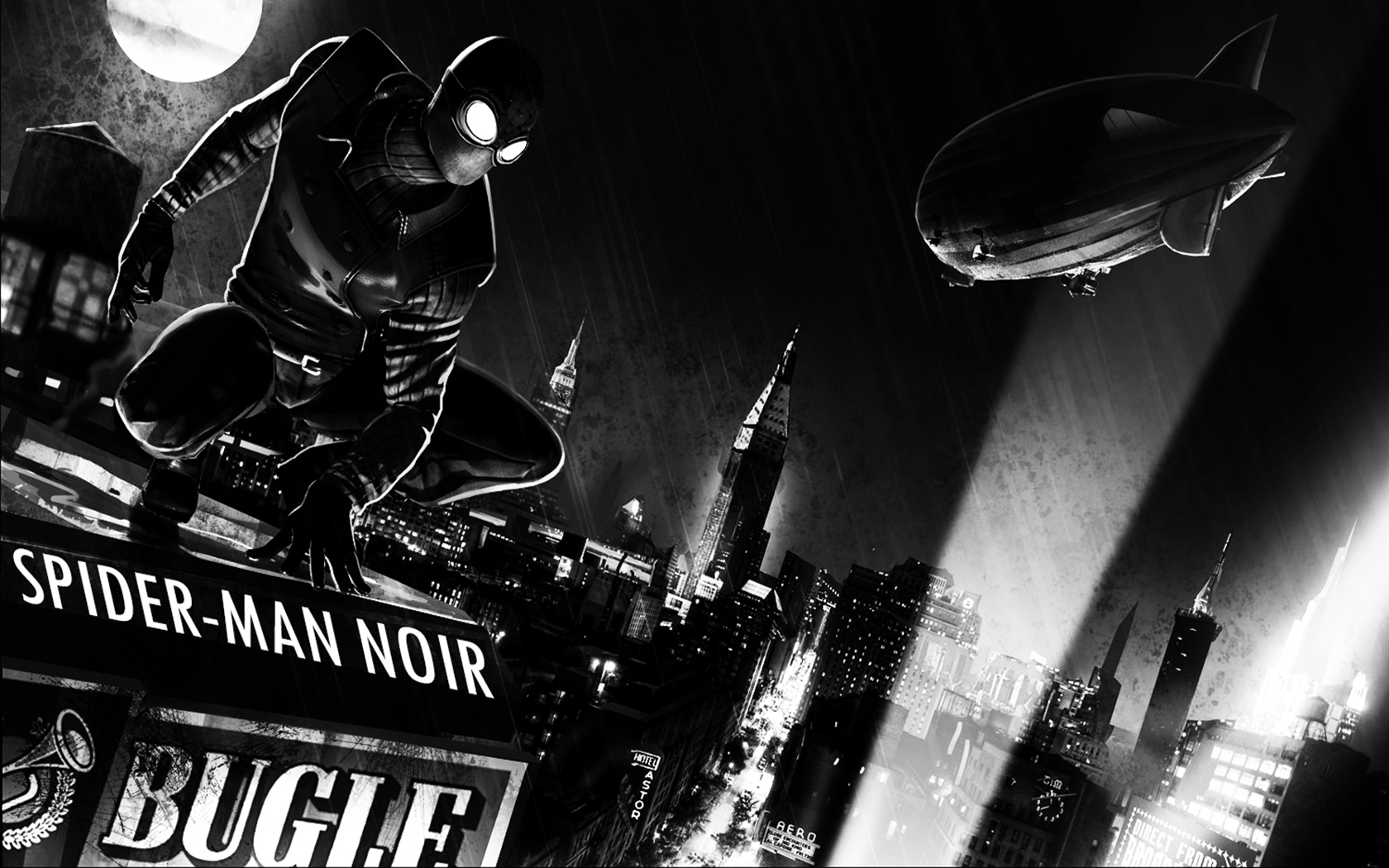 Description: A black and white photo of a spider man movie sign in the city at night with a flying object.