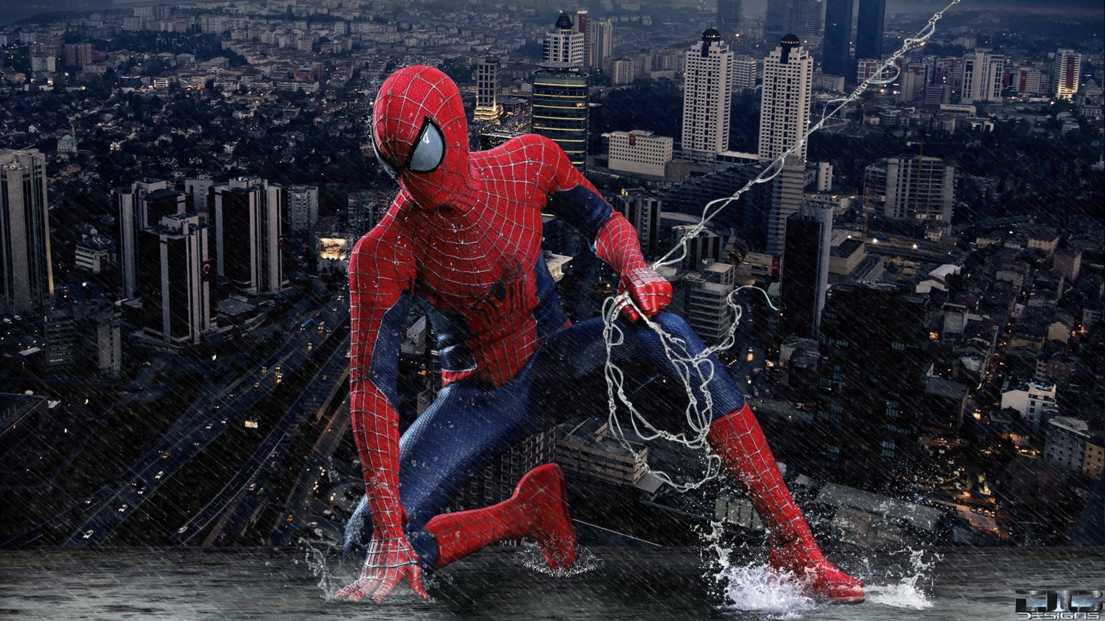 Description: A spider man is jumping in the air over a cityscape with a lightning bolt in his hand.