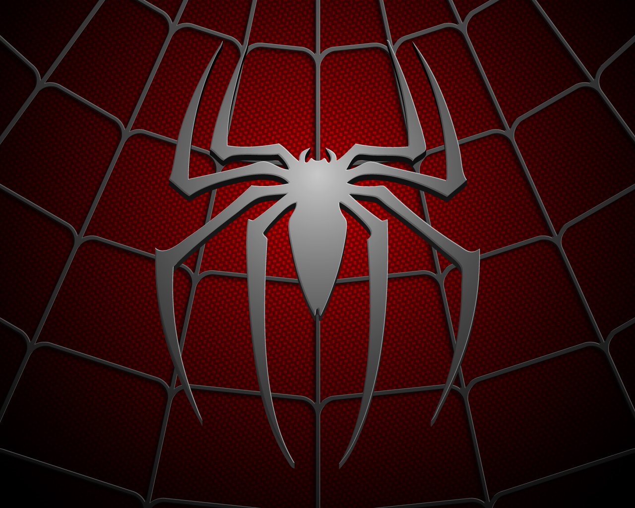 Description: A spider - man logo on a red background with a black web pattern in the center of the image.