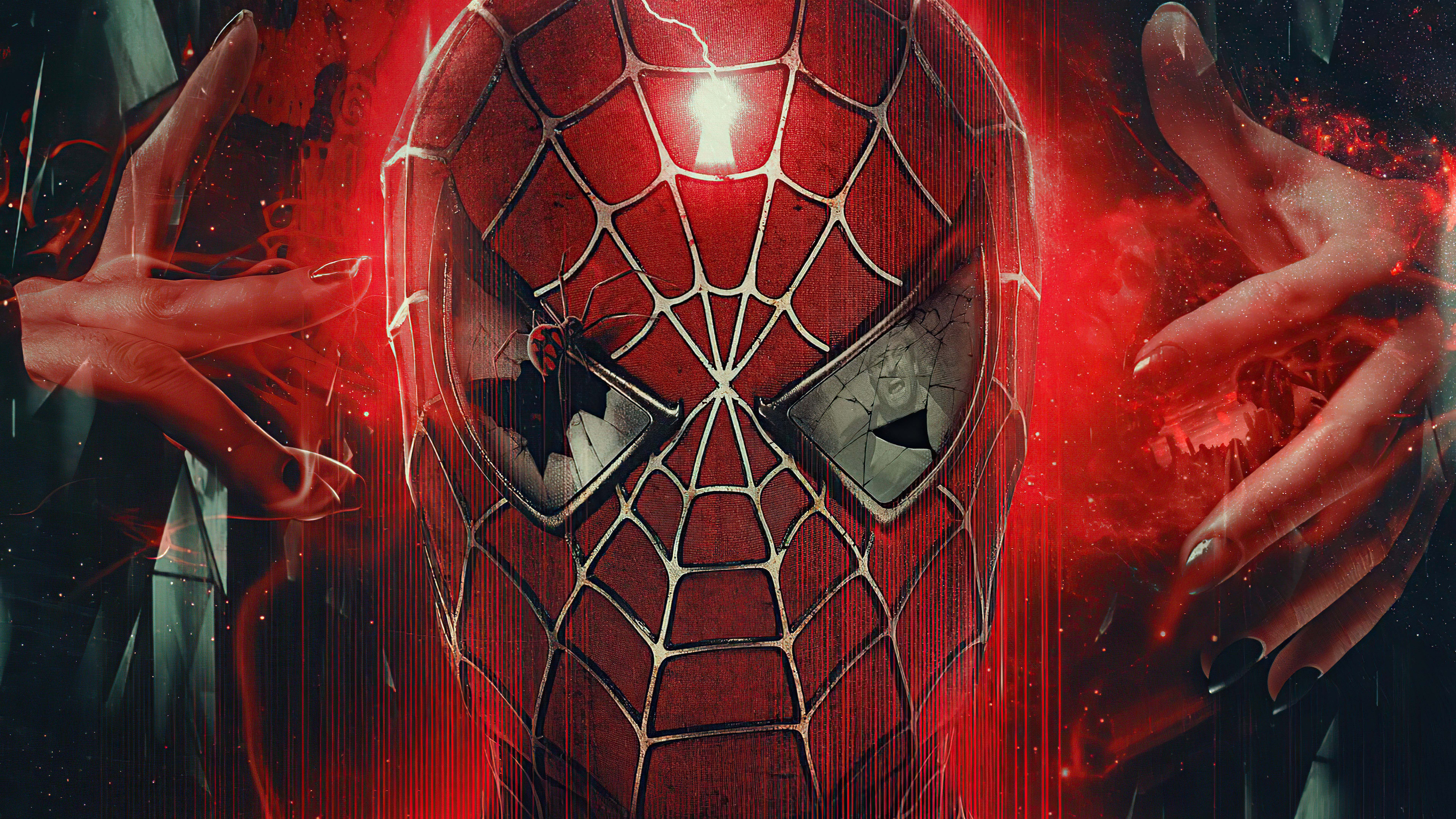 Description: A spider - man poster with hands holding it up in front of him and a red background with a spider - man face.