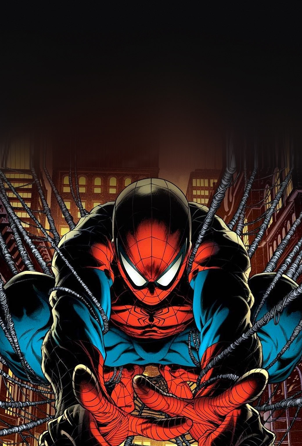 Description: A spider man is sitting on a ledge in the city at night with his hands on his chest and his hands on his chest.