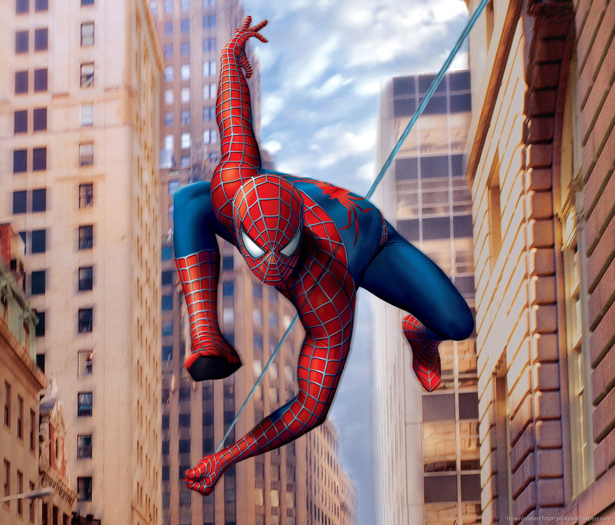 Description: A spider man is suspended from a high building in a city with skyscrapers in the background and a sky line.