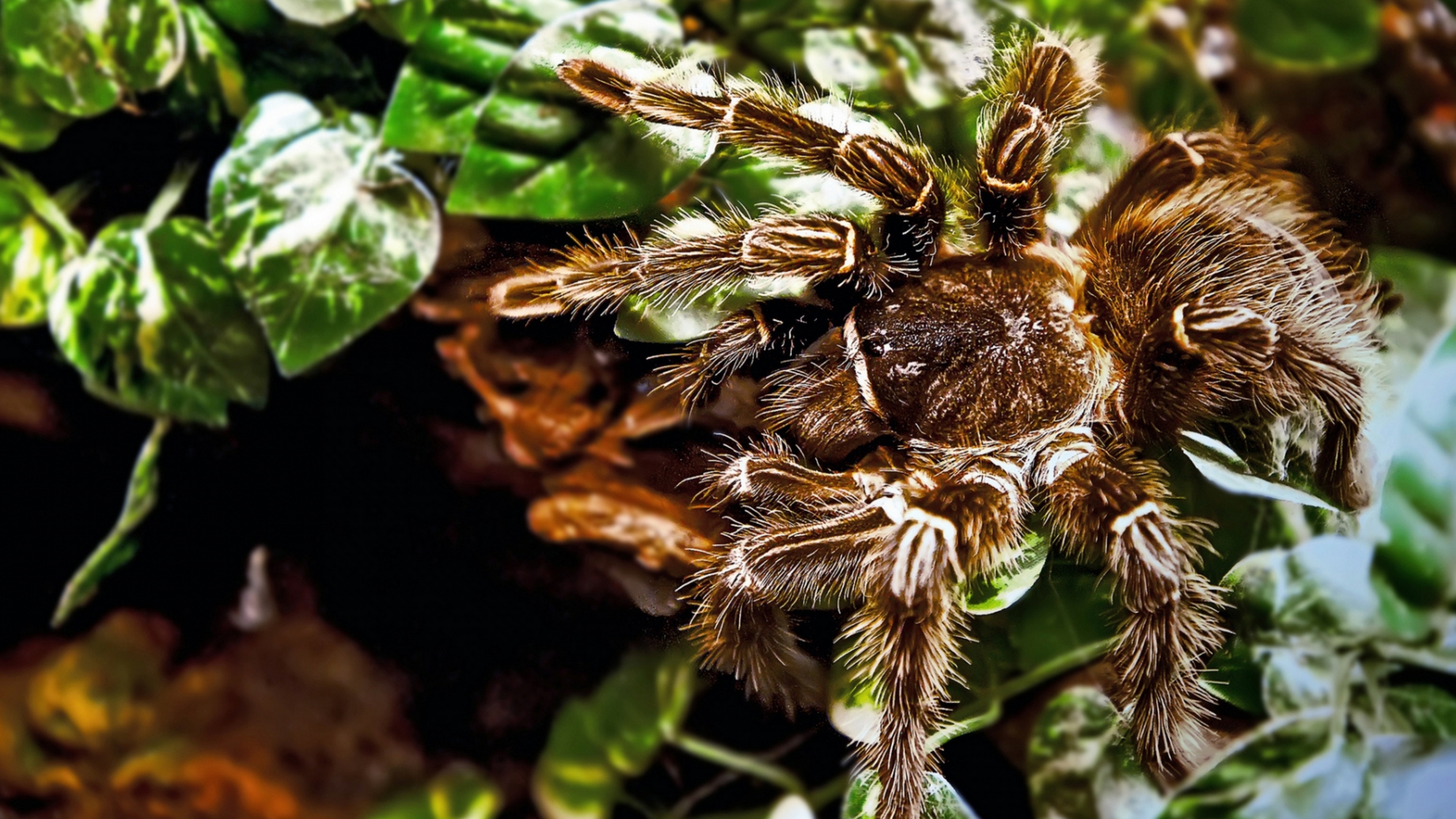 Description: A close up of a spider on a plant with leaves in the background and a blurry background of leaves.