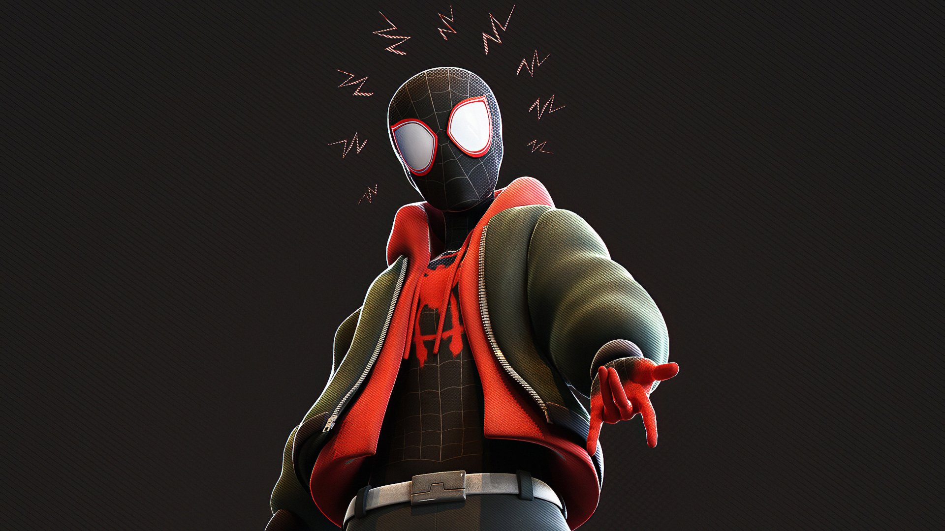 Description: A man in a spider suit with a red hoodie and a black background with a red and white spider.