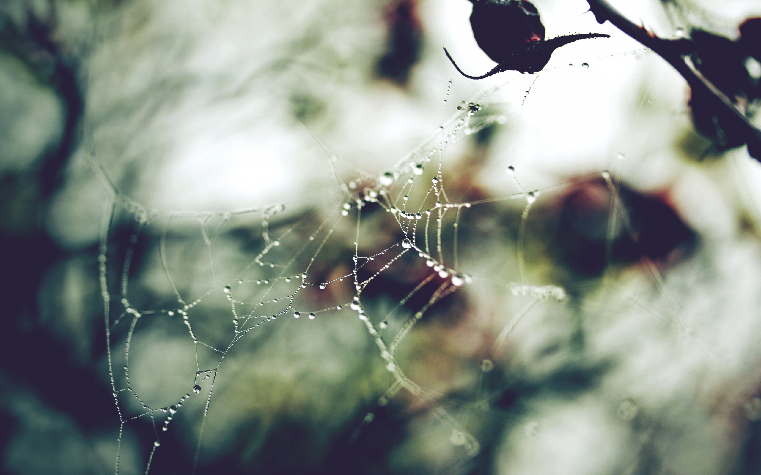 Description: A spider web with water droplets on it in a forest setting with trees in the background and a blurry sky.