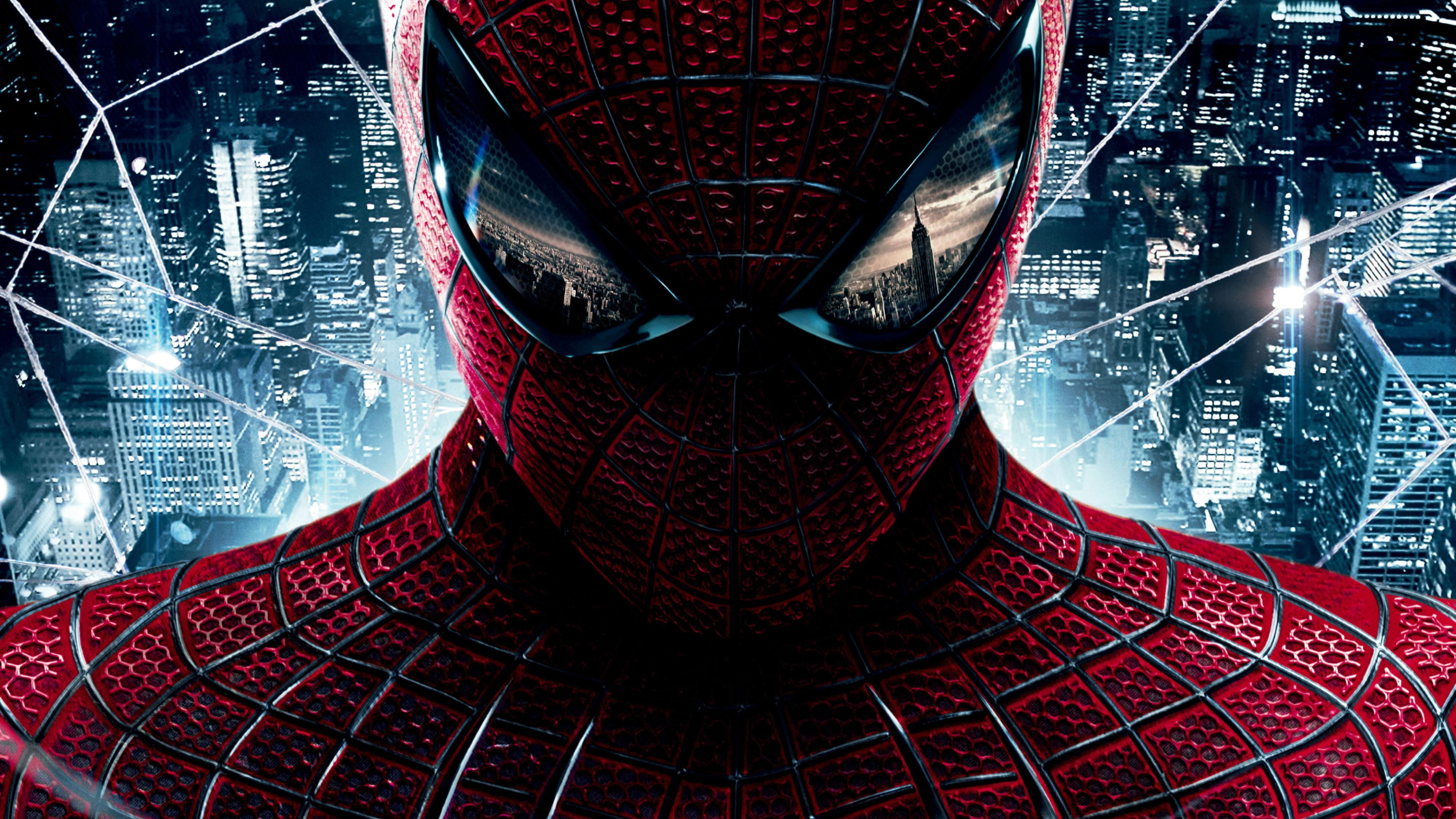 Description: A spider man in a suit with city lights in the background and a spider - man face in the foreground.