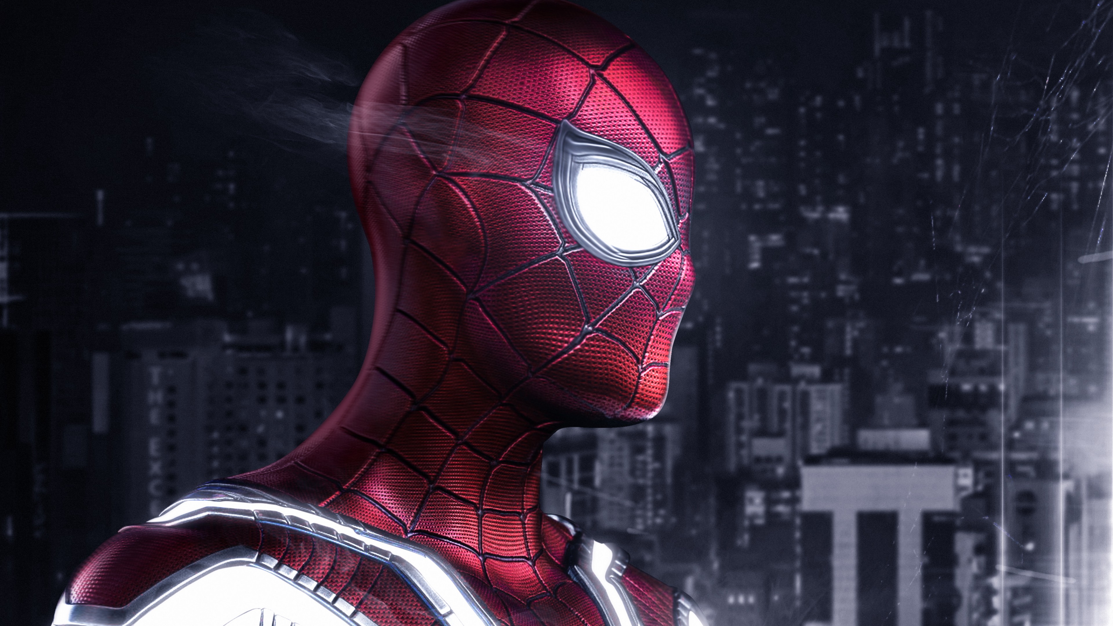 Description: A spider man standing in front of a city skyline with a clock in his hand and a glowing face.