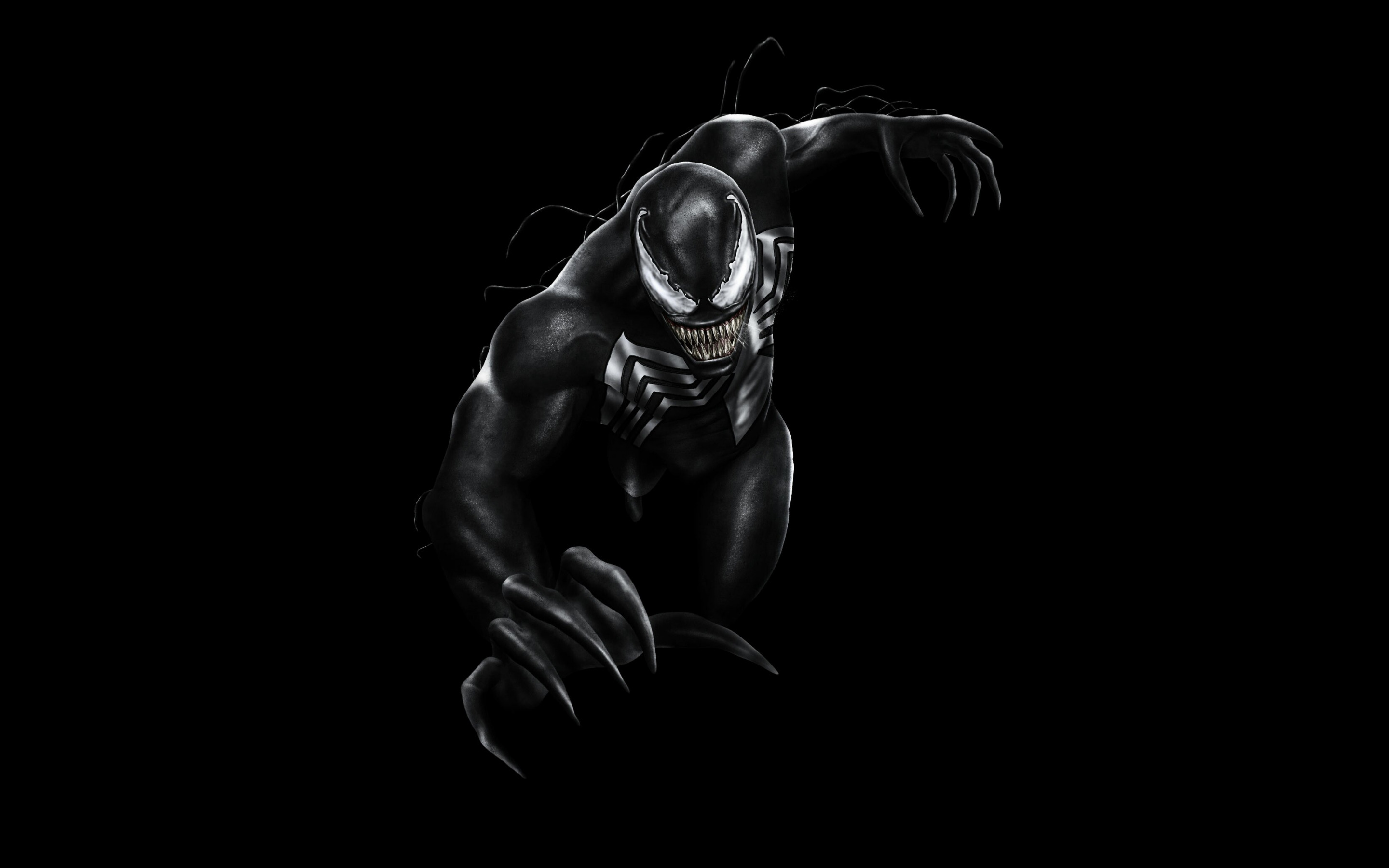 Description: A black and white photo of a spider man in the dark with his hands out and his face slightly obscured by the spider.