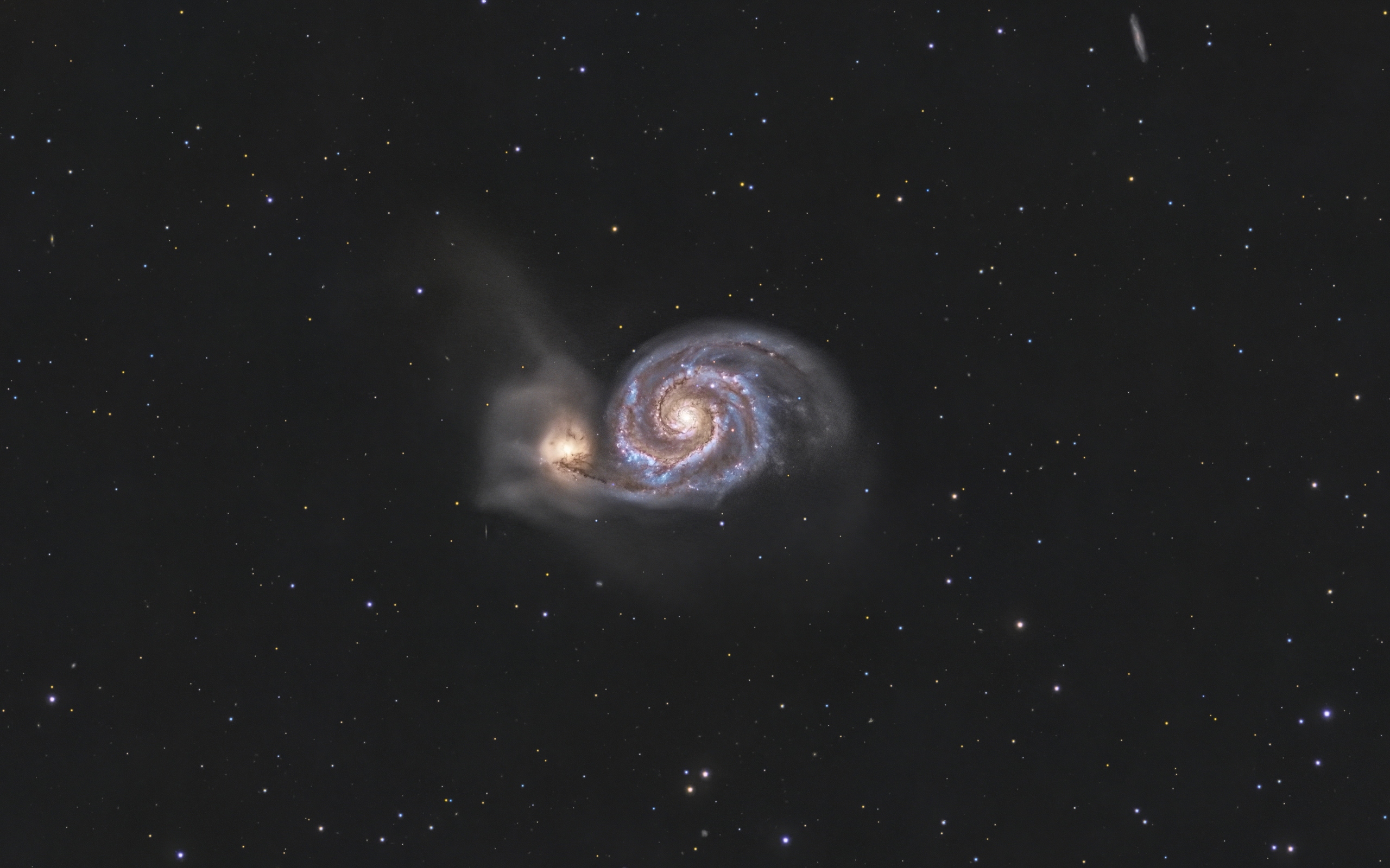 Description: A spiral galaxy with a star in the middle of it's center and a black background with stars.