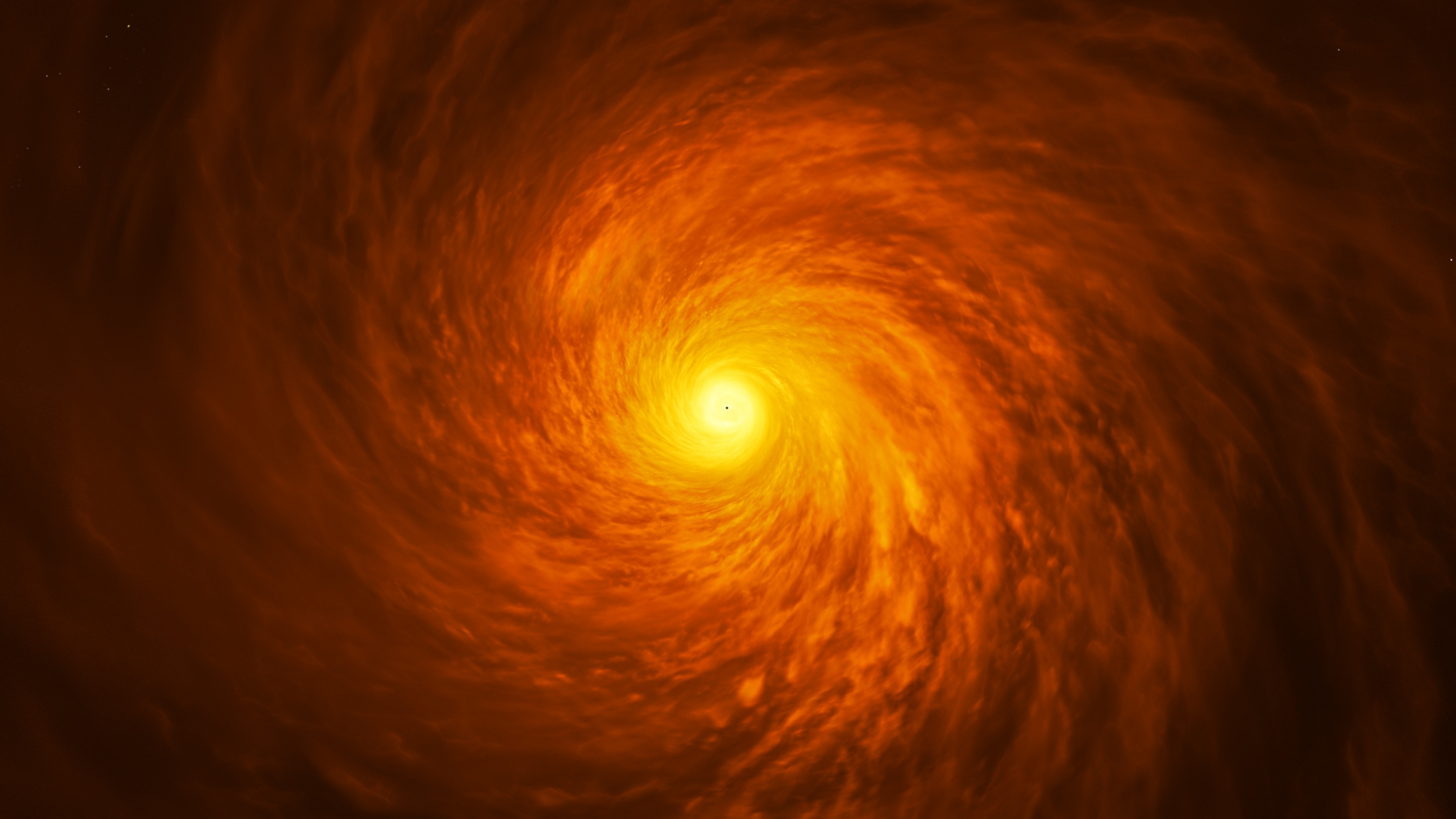 Description: A spiral of orange and yellow light in the dark sky with stars in the background and a bright yellow light in the center.