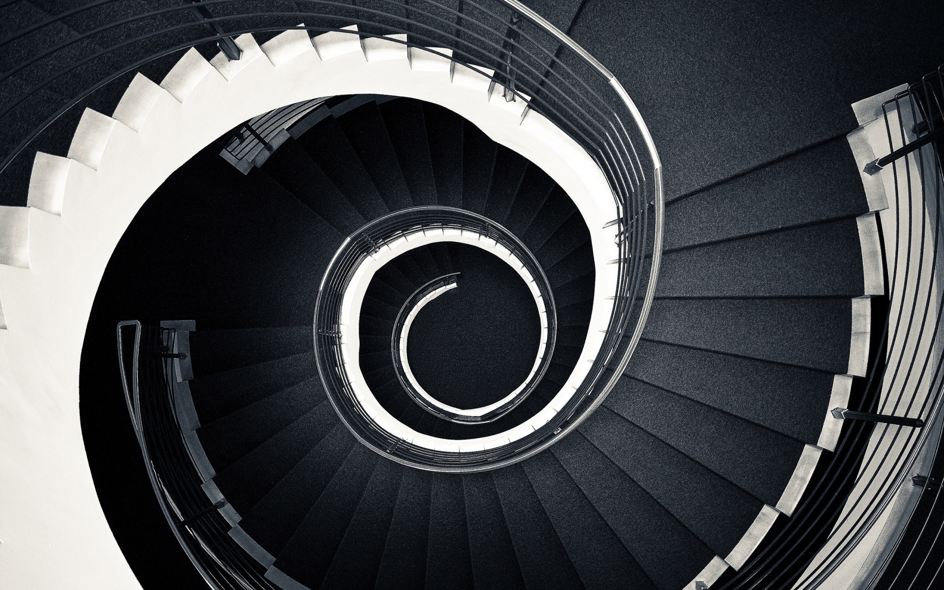 Description: A spiral staircase with a black and white photo of it's railings and railings are shown.