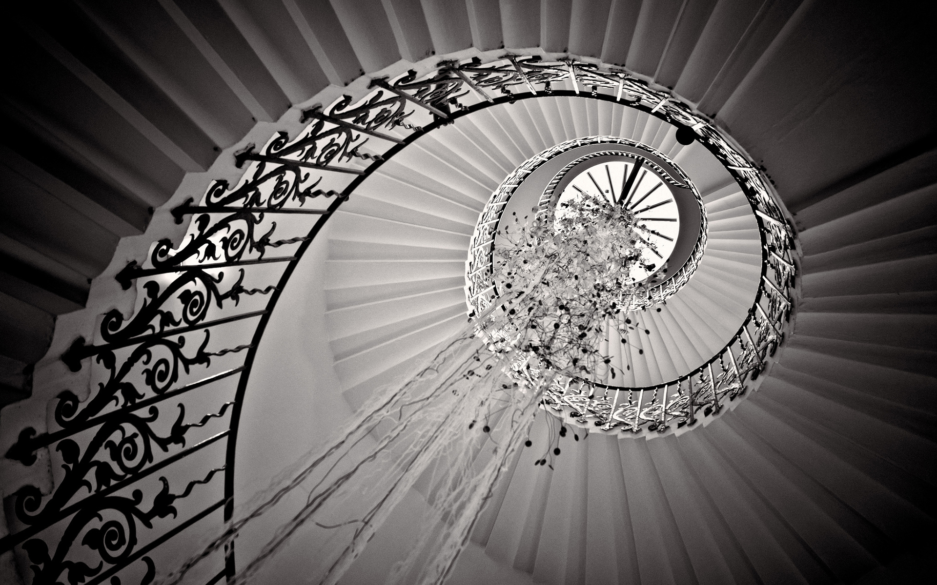 Description: A spiral staircase with chandelier hanging from it's sides in black and white photo with a circular light fixture.