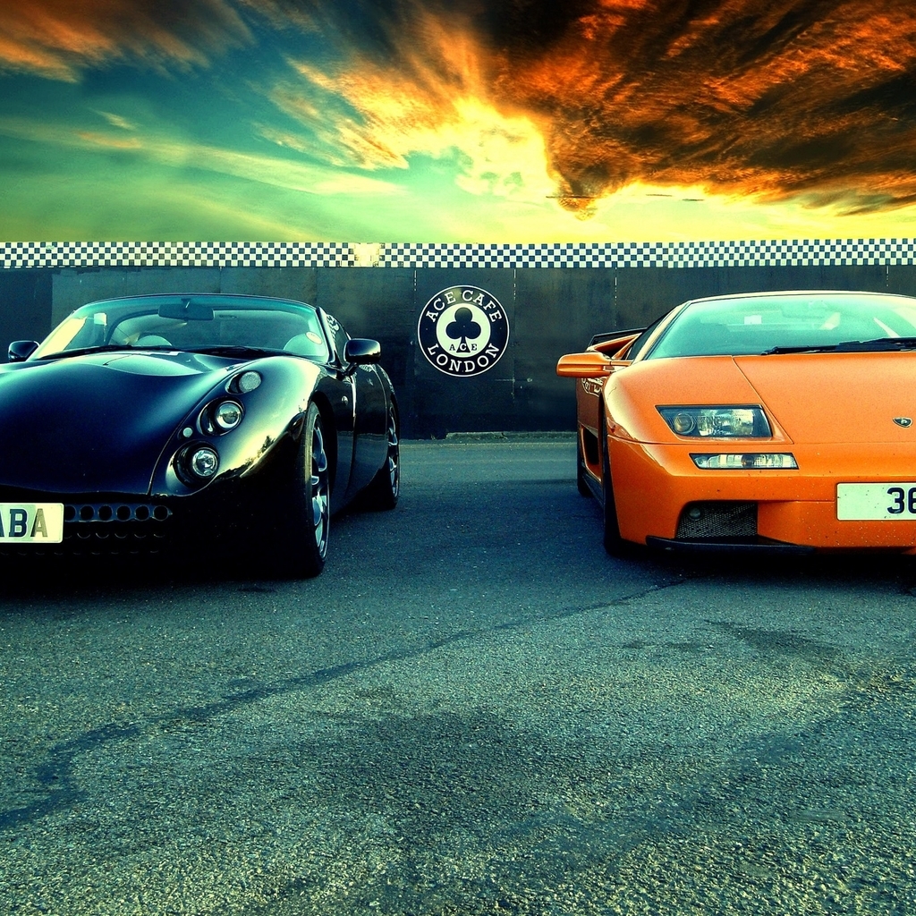 Description: Two sports cars parked next to each other on a parking lot at sunset or sunrise with clouds in the background.