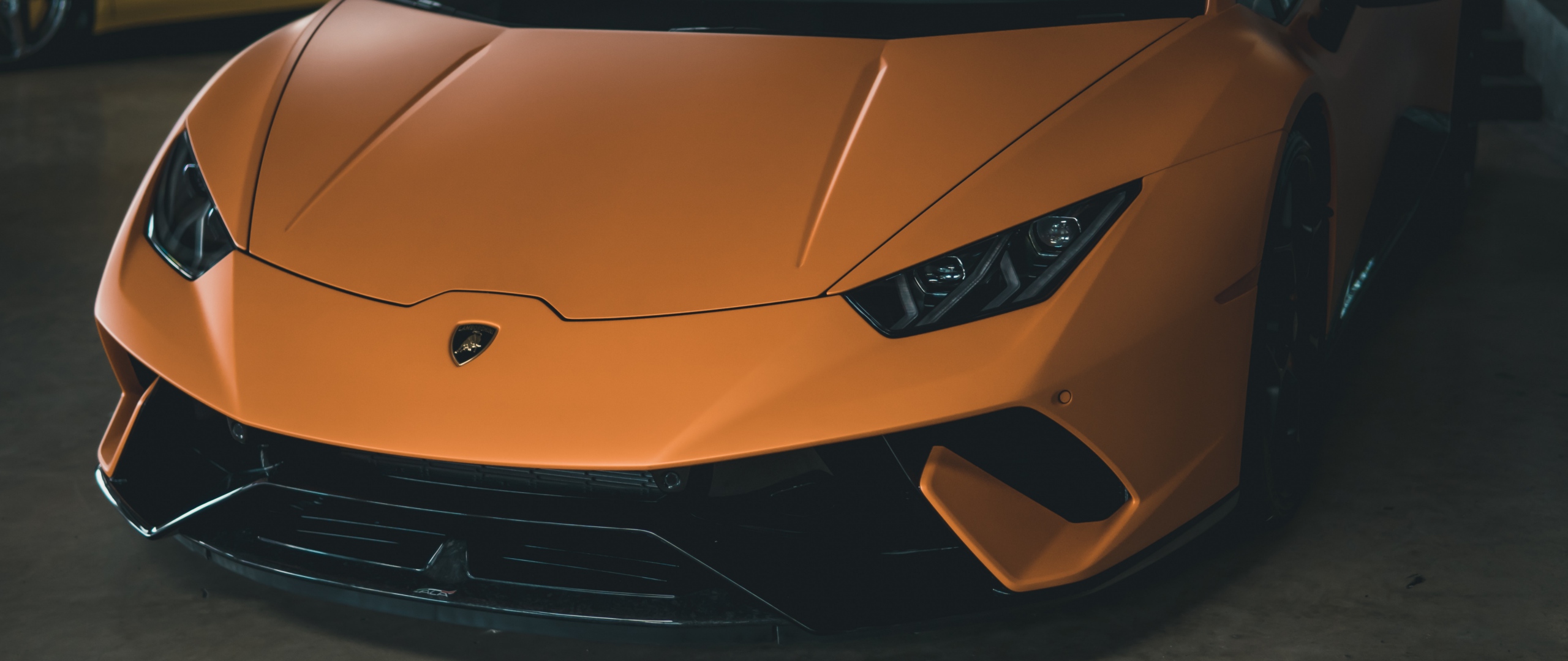 Description: A close up of a sports car in a garage with other cars in the background and a person standing next to it.