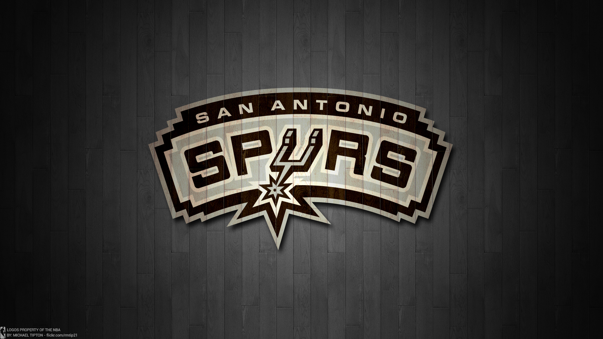 Description: The san antonio spurs logo on a wall in a dark room with wood paneling and a wooden floor.