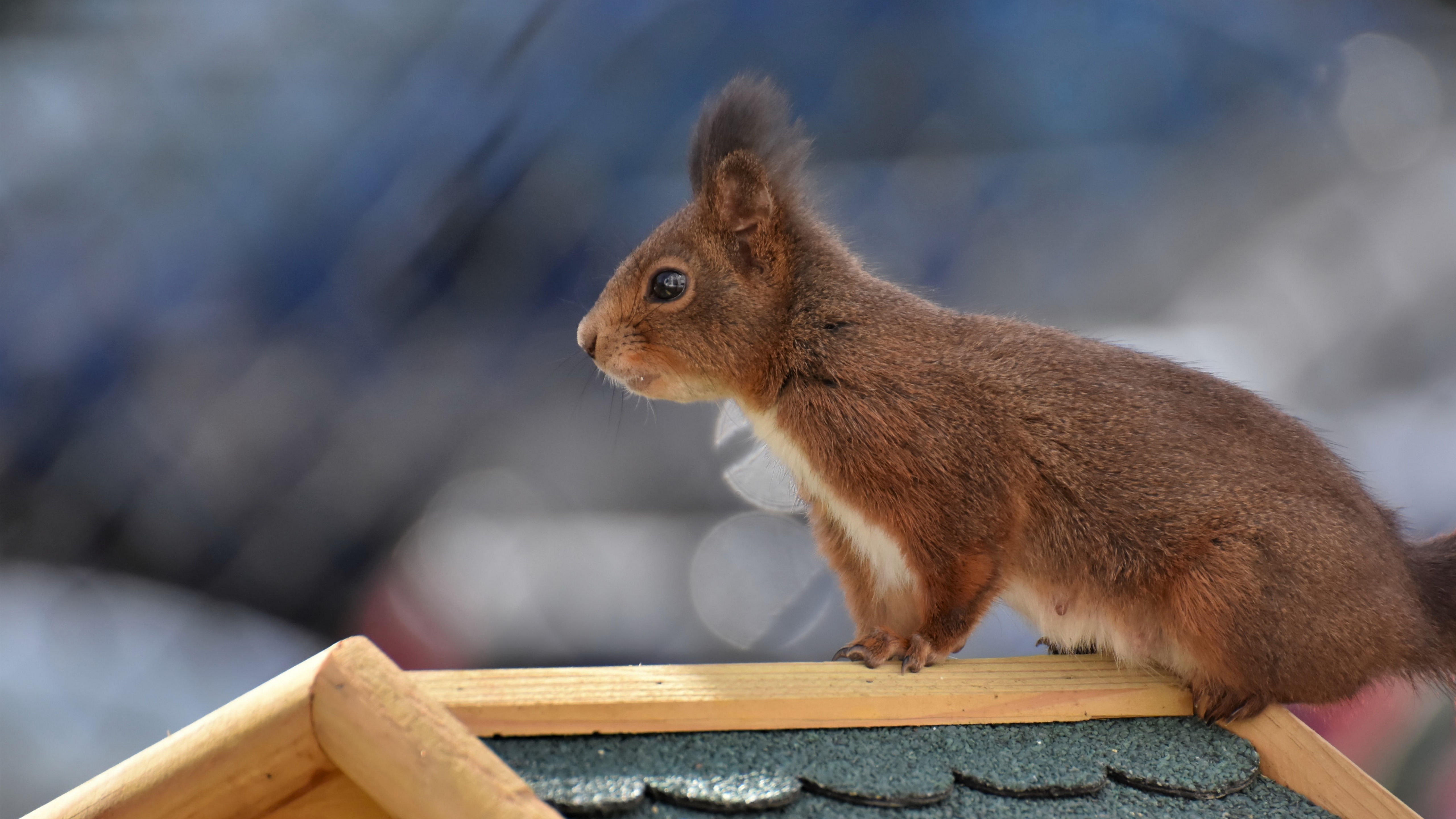 Description: A squirrel is sitting on top of a bird house and looking at the camera man's eye is on the roof.