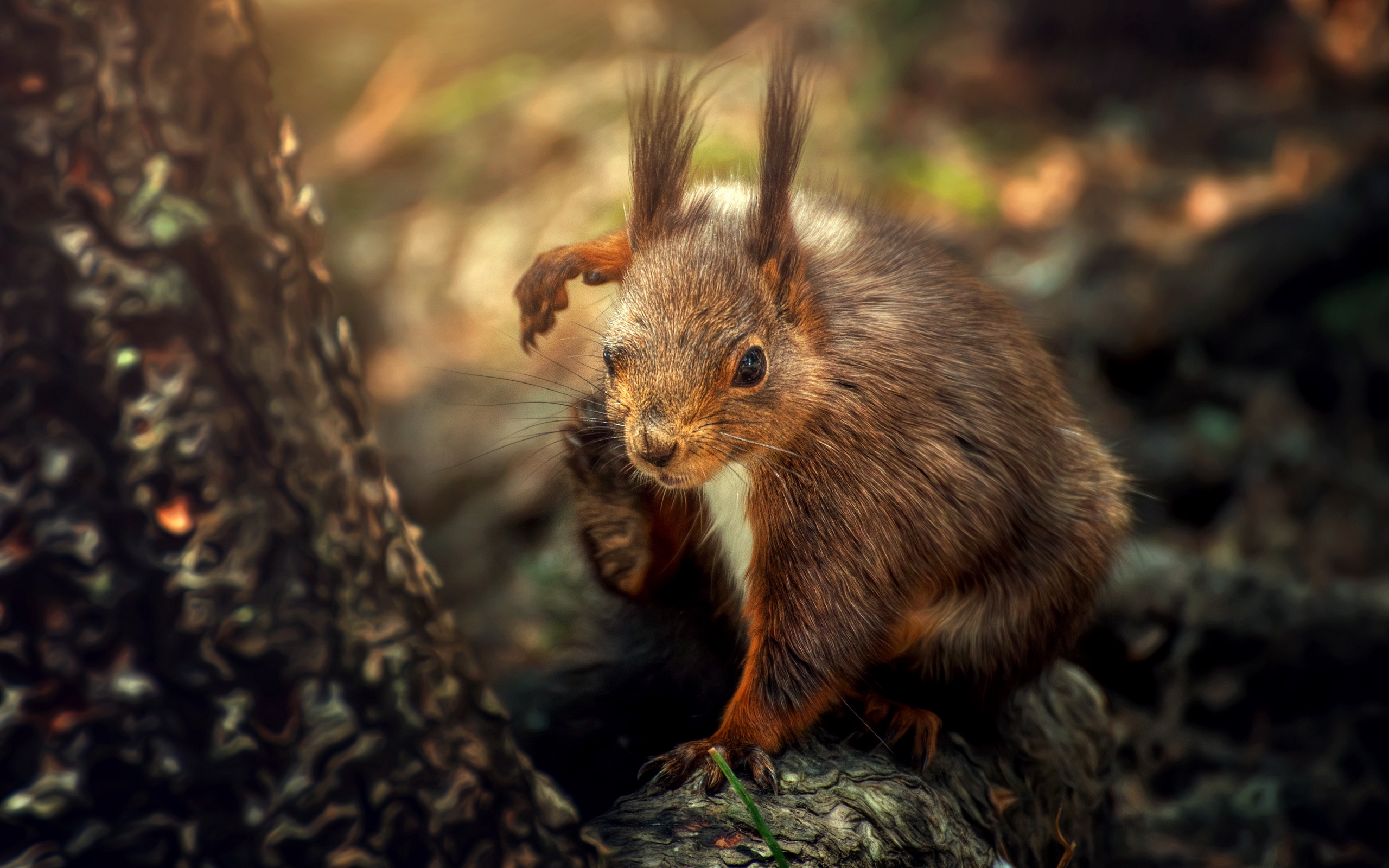 Description: A squirrel is standing on a tree branch and looking at the camera with a blurry background of leaves and branches.