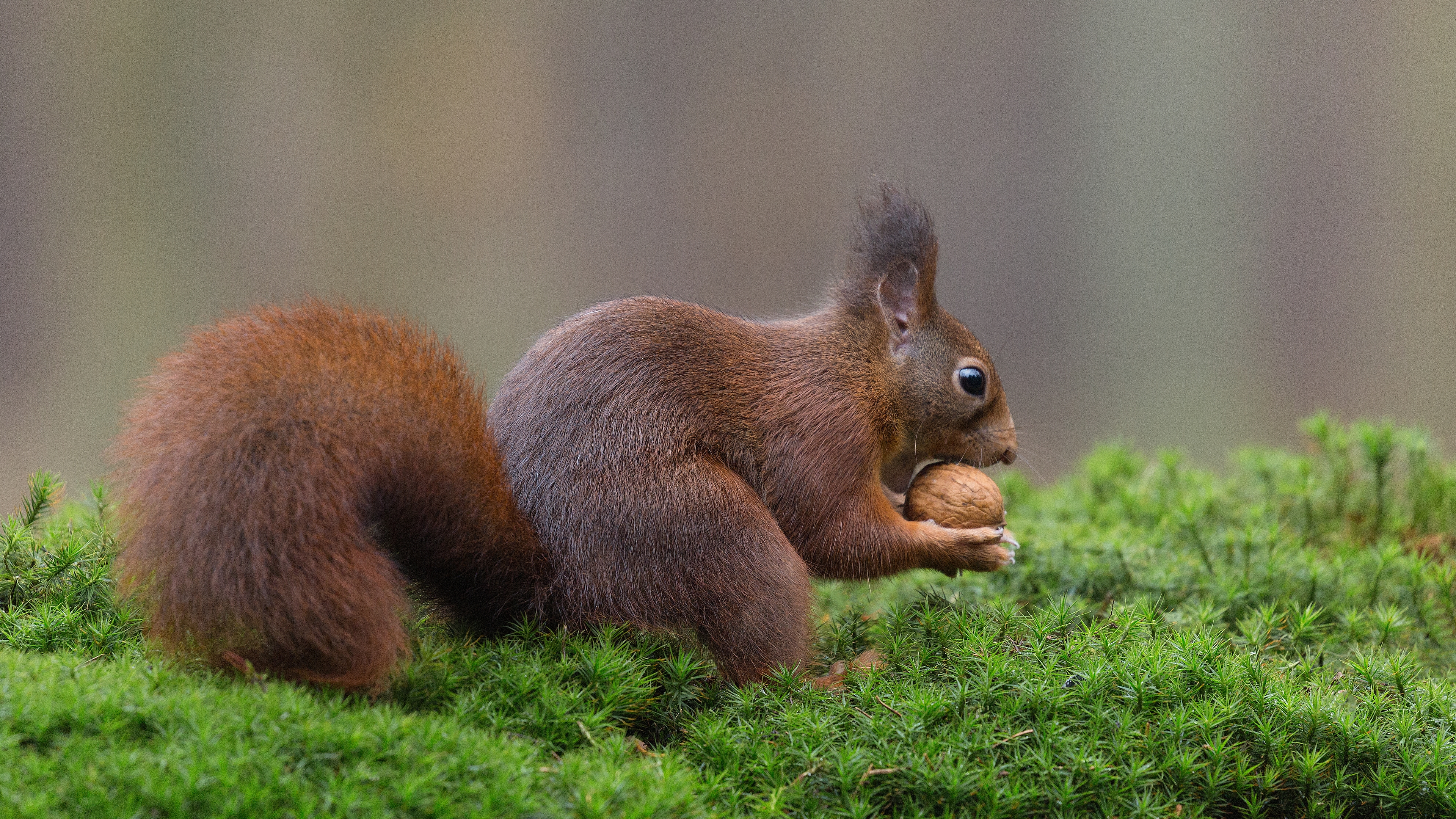 Description: A squirrel eating a nut on a mossy surface in the woods.