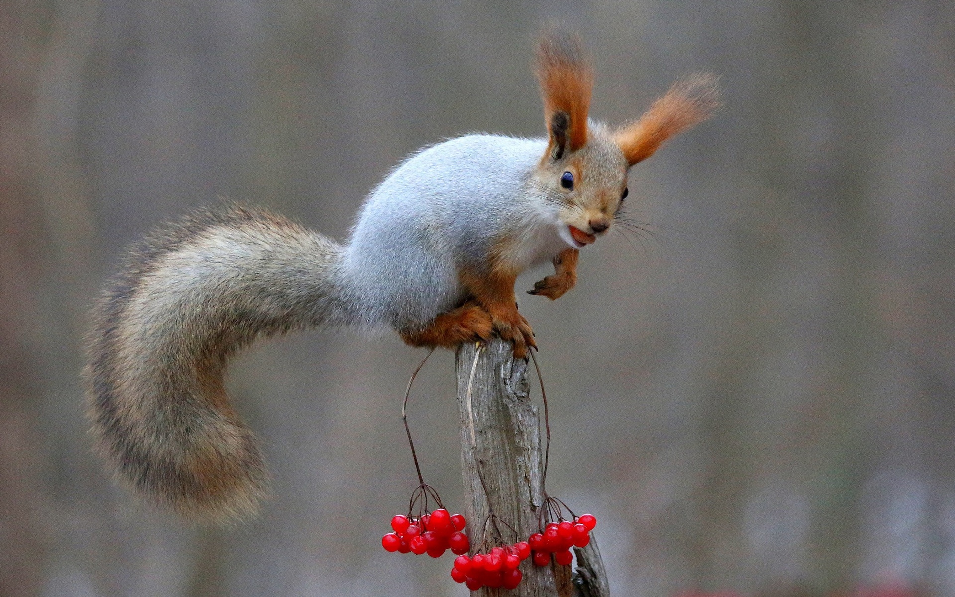 Description: A squirrel is sitting on a tree stump eating berries from a tree trunk with a blurry background of trees.