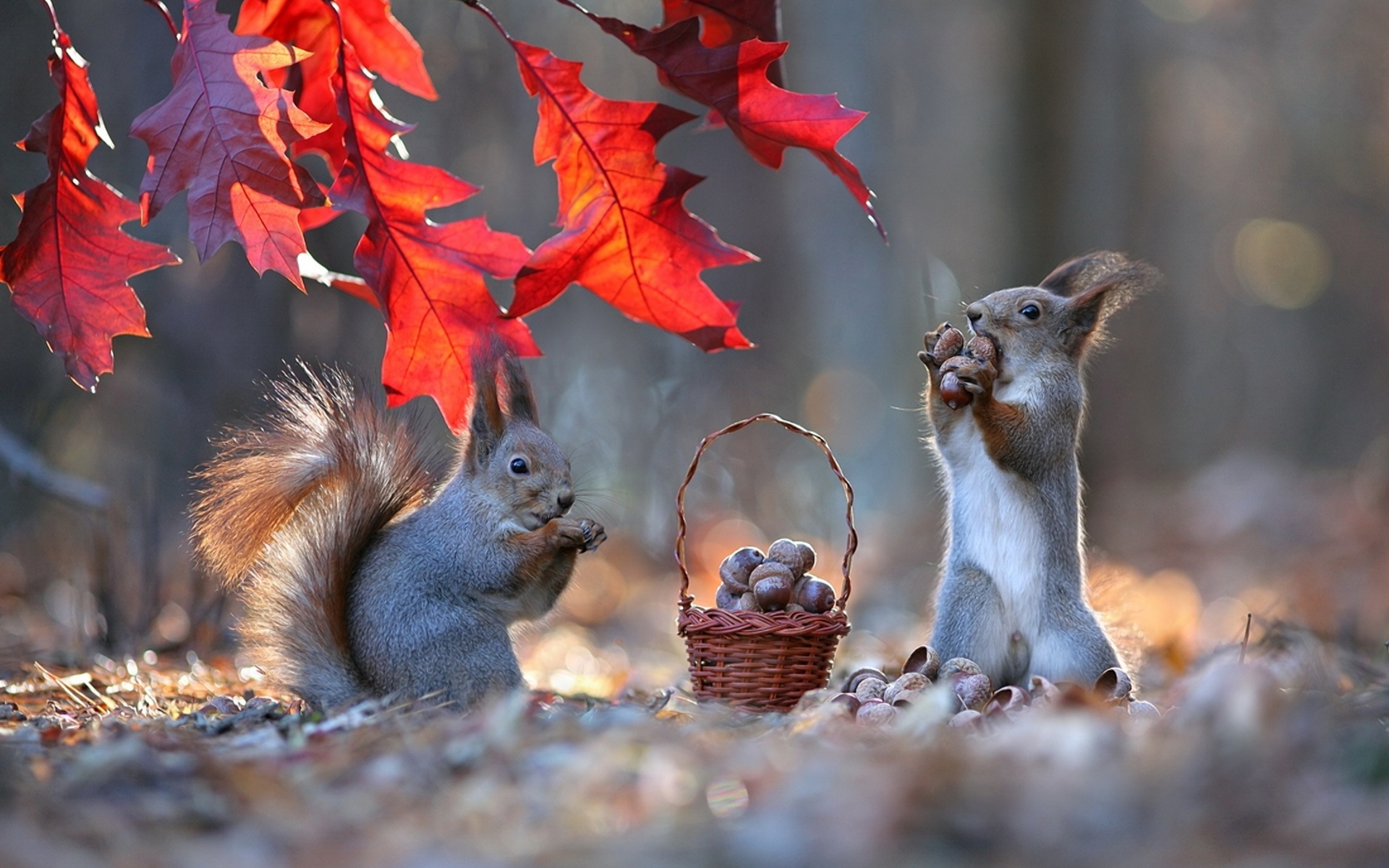 Description: Two squirrels are eating nuts from a basket under a tree with red leaves in the background and a basket with nuts in the foreground.