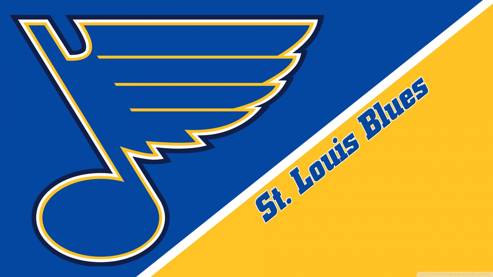 Description: A st louis blues logo on a blue and yellow background with a yellow stripe and a white st louis logo.