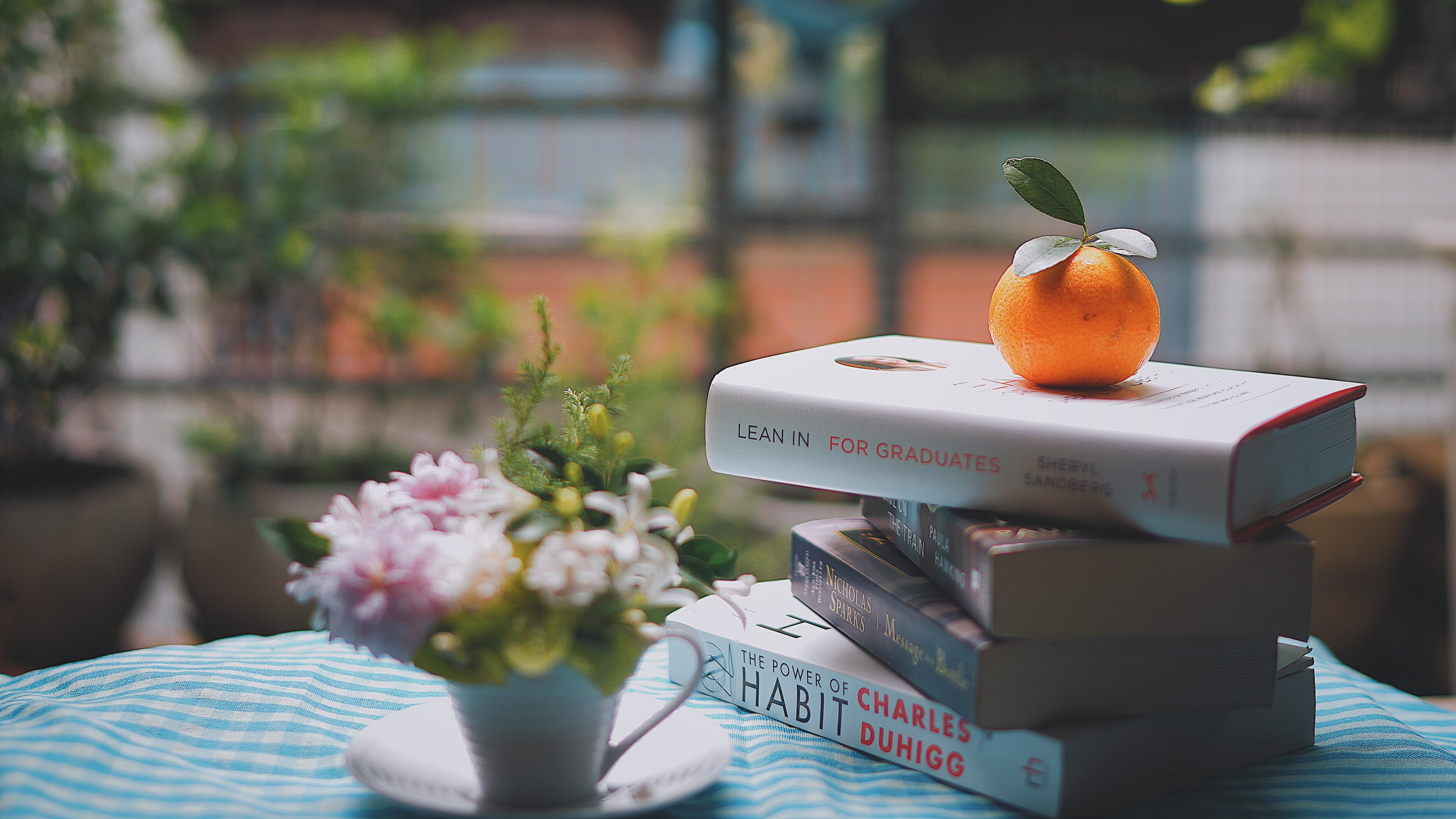 Description: A stack of books with a small orange on top of them sitting on a table with a vase of flowers.