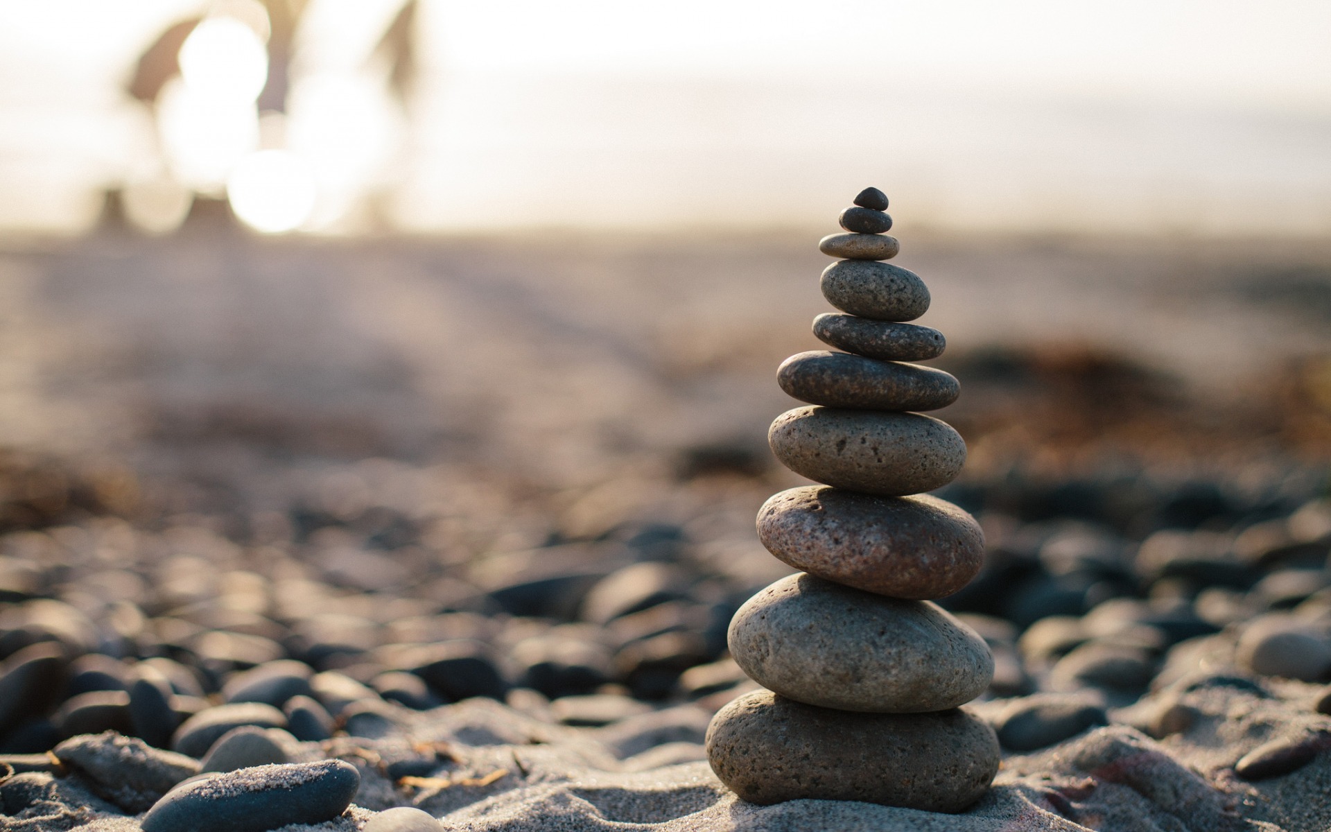 Description: A stack of rocks sitting on top of a beach next to a bike tire on the beach near the ocean.