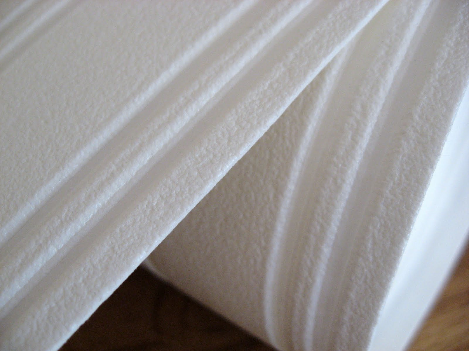 Description: A stack of white paper sitting on top of a wooden table next to a red and white sign that says.