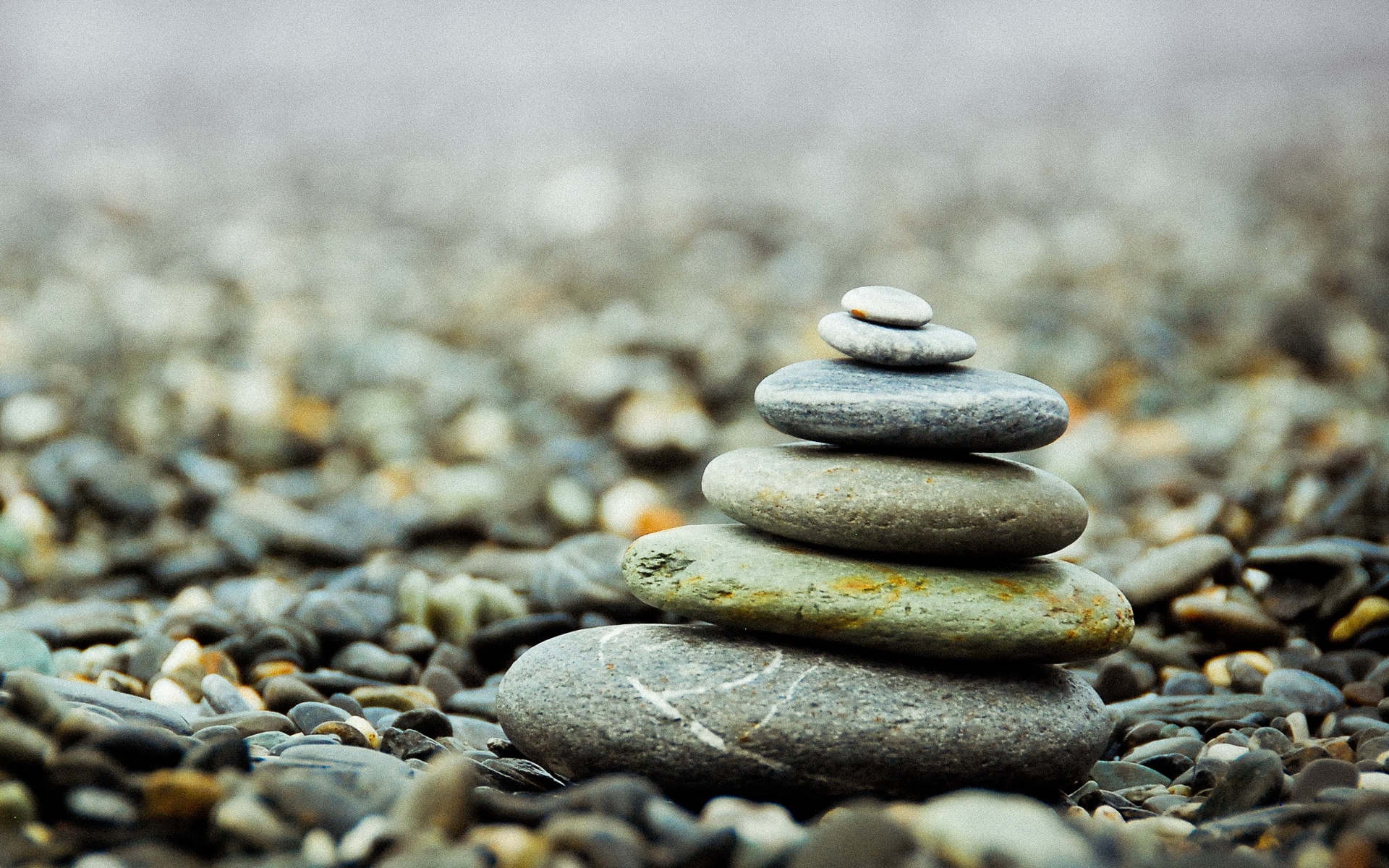 Description: A stack of rocks sitting on top of a pile of gravel covered ground with a blurry background of rocks.